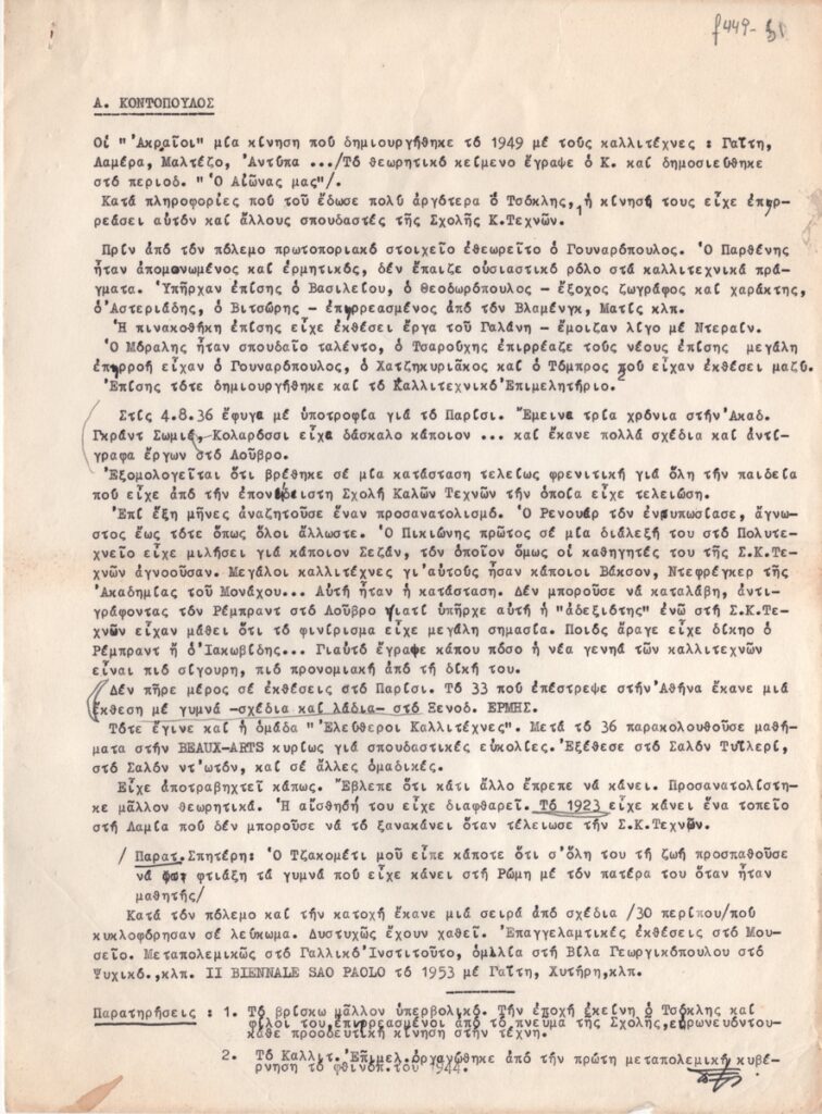 Κείμενο, δακτυλόγραφο, στα ελληνικά, χαρτί, 29,0×21,3 εκ. Κείμενο του Τώνη Σπητέρη (;) για τα νεανικά χρόνια και την καλλιτεχνική πορεία του ζωγράφου Αλέκου Κοντόπουλου. Στην επιφάνεια του κειμένου επιγραφές.