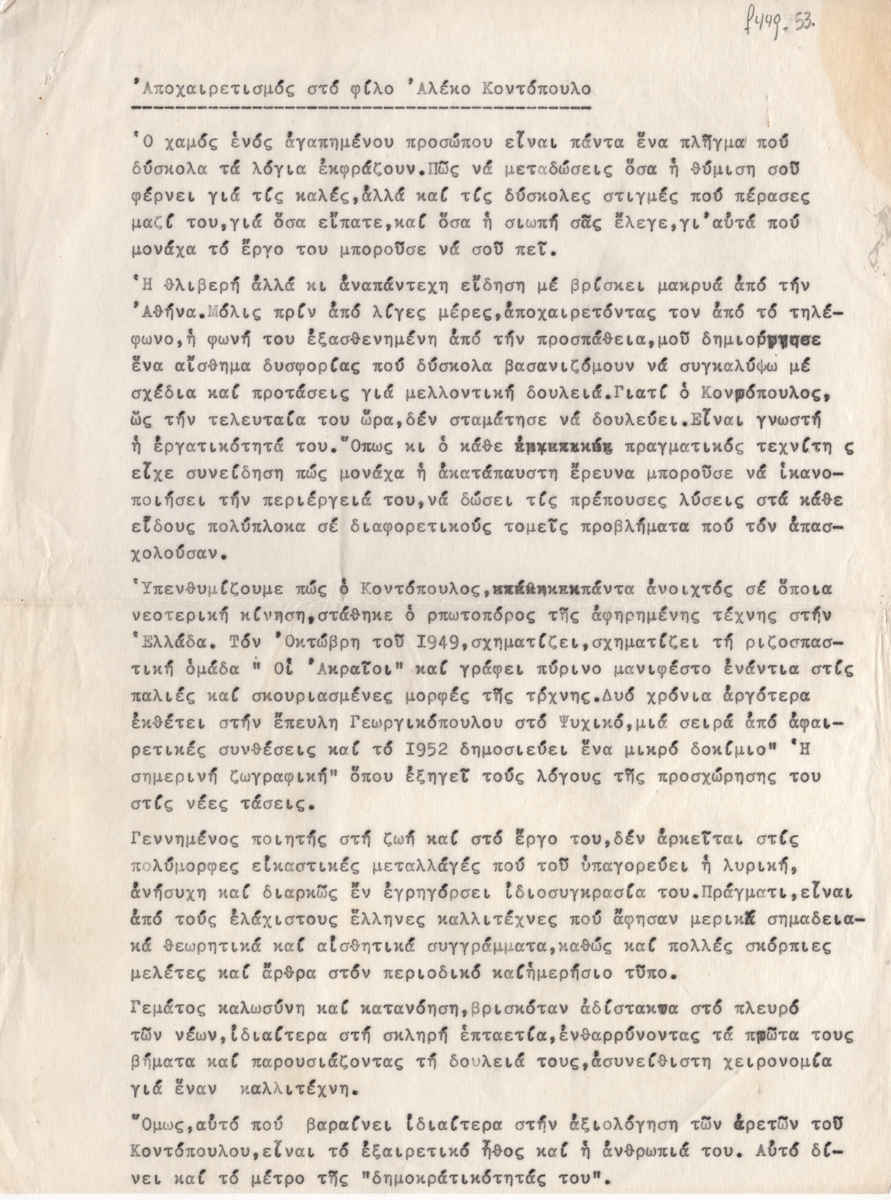 Κείμενο, δακτυλόγραφο, στα ελληνικά, 2 φφ., χαρτί, 28,5×21,5 εκ. Κείμενο του Τώνη Π. Σπητέρη για τον θάνατο του ζωγράφου Αλέκου Κοντόπουλου γραμμένο στην Ύδρα.