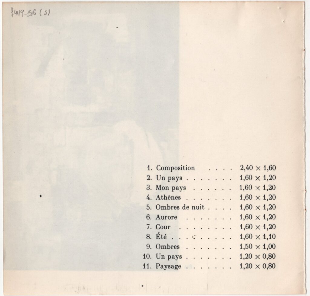 Κώστας Ανδρέου (1917 - 2007) ; Δημήτρης Α. Φατούρος (1928 - 2020) ; Ιωάννα Σπητέρη-Βεροπούλου (1920 - 2000) ; Eugène Delacroix (1798 - 1863) ; Γιώργος Τούγιας (1922 - 1994) ; Γαβριέλλα Σίμωσι (1926 - 1999) ; Κώστας Τσόκλης (1930) ; Γεράσιμος Σκλάβος (1927 - 1967) ; Άγγελος Αγγελόπουλος (1904 - 1995) ; Αλέκος Κοντόπουλος (1904 - 1975) ; Άλεξ Μυλωνά (1923 - 2016) ; Ντίκος Βυζάντιος (1924 - 2007) ; Berto Lardera ; Κώστας Βαλσάμης (1908 - 2003) ; Γιάννης Γαΐτης (1923 - 1984) ; Λε Κορμπιζιέ (1887 - 1965) ; Georges Mathieu (1921 - 2012) ; Θόδωρος (Παπαδημητρίου) (1931 - 2018) ; Τάκις (Βασιλάκης Παναγιώτης) (1925 - 2019) ; Victor Vasarely ; Φιλόλαος (Τλούπας) (1923 - 2010) ; Νίκος Κεσσανλής (1930 - 2004) ; Τίτα Κριεζή (1930 - 2021) ; Αγλαΐα Λυμπεράκη (1923 - 1985) ; Γιάννης Μαλτέζος (1915 - 1987) ; Ιάσων Μολφέσης (1925 - 2009) ; Κώστας Πανιάρας (1934 - 2014) ; Κώστας Καρράς (1936 - 2012) ; Γιώργος Βαφειάδης