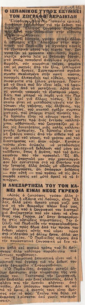 Απόκομμα, χαρτί, 18×5,5 εκ., στα ελληνικά, δημοσίευσης άρθρου αναφερόμενου σε κριτικές που ασκήθηκαν στον Δημήτρη Περδικίδη για το έργο του που παρουσίασε σε έκθεσή του στην Μαδρίτη.