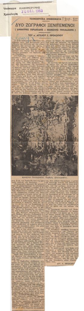 Απόκομμα, χαρτί ακανόνιστου μεγέθους, στα ελληνικά, δημοσίευσης κριτικής εκθέσεων των Δημήτρη Περδικίδη και Μανώλη Πηλαδάκη, οι οποίες διεξάγονται αντίστοιχα στην Αίθουσα Τέχνης Αθηνών Χίλτον και Γκαλερί Νέες Μορφές αντίστοιχα.