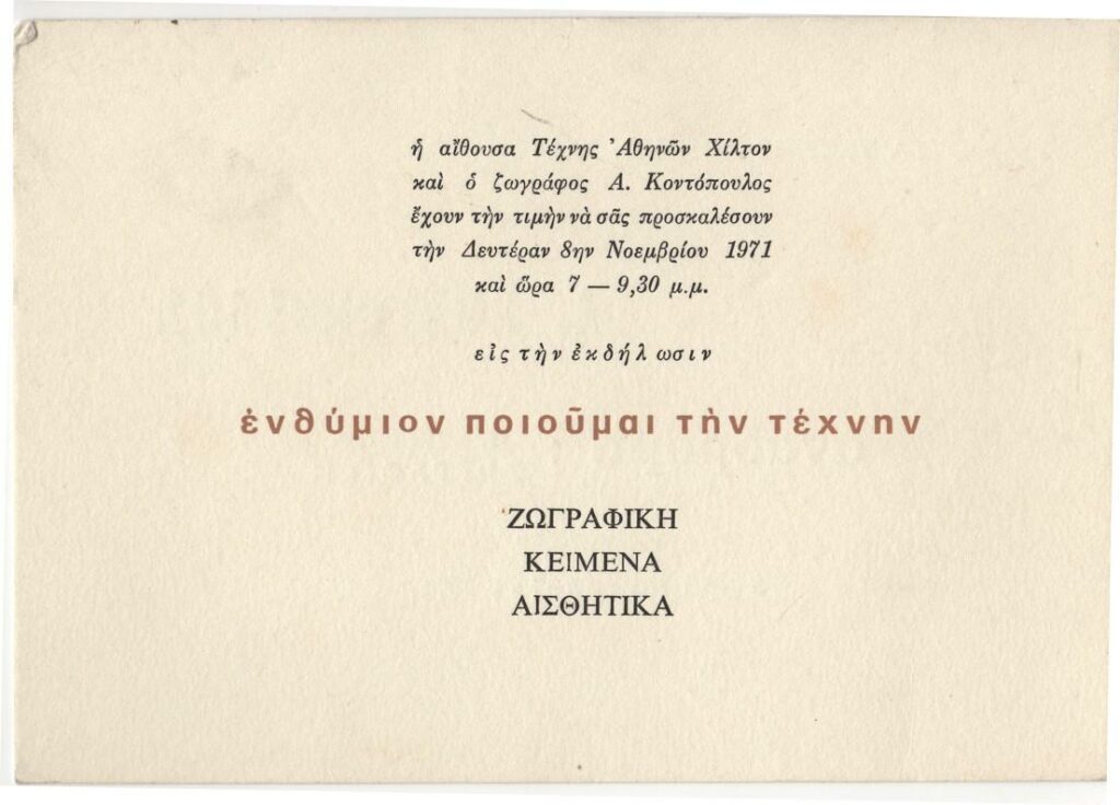Πρόσκληση στην εκδήλωση με τίτλο “Ενθύμιον ποιούμαι την τέχνην. Ζωγραφική, κείμενα, αισθητικά” στα πλαίσια των εγκαινίων της ατομικής έκθεσης ζωγραφικής του Αλέκου Κοντόπουλου στην Αίθουσα Τέχνης Αθηνών Χίλτον.