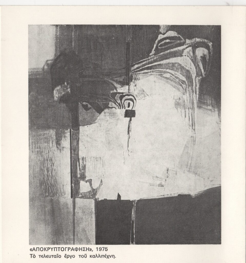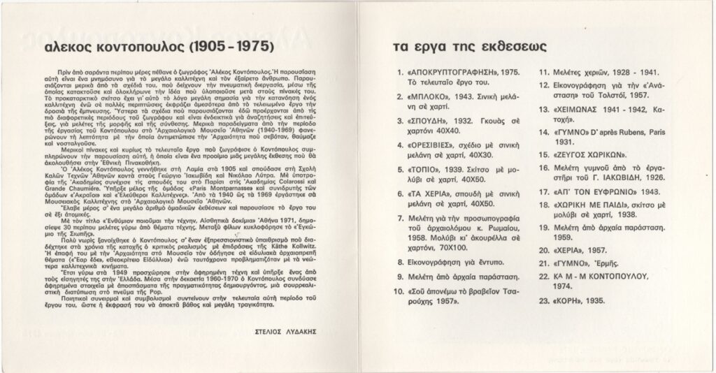 Έντυπο έκθεσης, στα ελληνικά, δίπτυχο, χαρτόνι, 17,3×16,6 εκ. Έκθεση σχεδίων και πινάκων του ζωγράφου Αλέκου Κοντόπουλου στην Αθήνα το 1975. Περιέχει σύντομο σημείωμα του Στέλιου Λυδάκη και κατάλογο έργων έκθεσης. Εικονογραφείται με ανπαραγωγή φωτογραφίας και έργων του καλλιτέχνη.