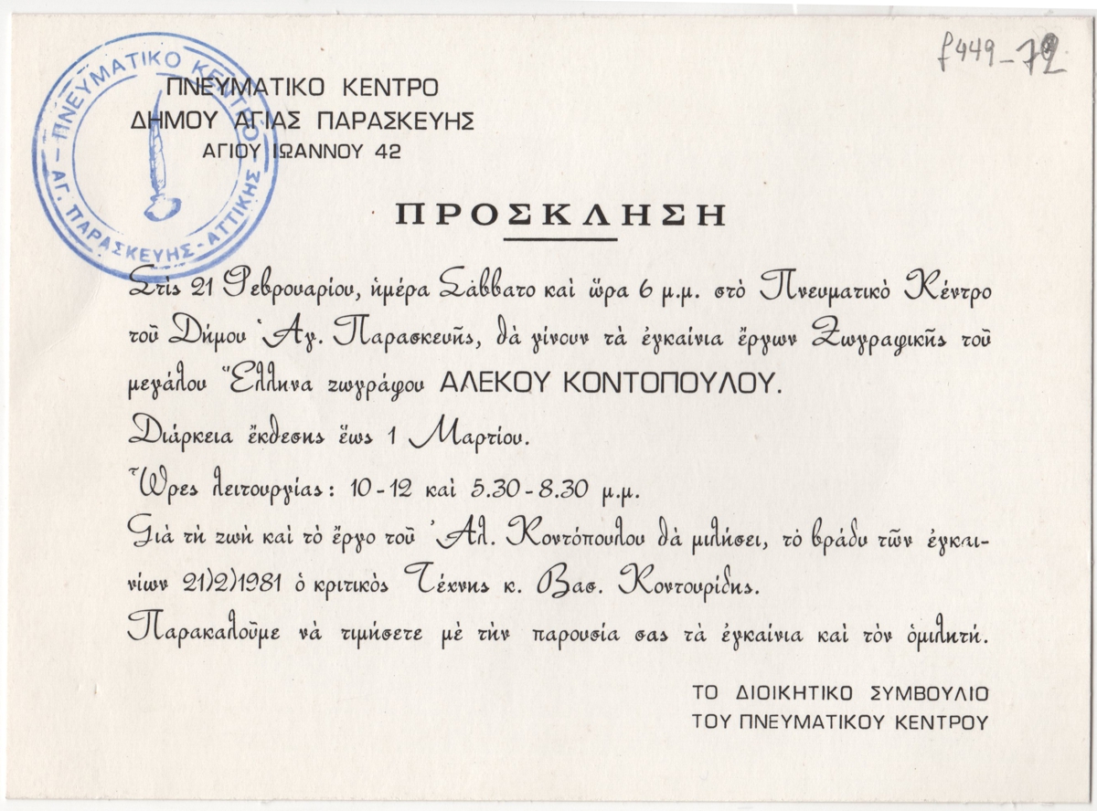 Έντυπο έκθεσης, στα ελληνικά, μονόφυλλο, χαρτόνι, 12,4×17,0 εκ. Πρόσκληση εγκαινίων της έκθεσης έργων του ζωγράφου Αλέκου Κοντόπουλου στην Αθήνα το 1981. Στην εκδήλωση περιλαμβάνεται ομιλία του κριτικού τέχνης Βασίλη Κοντουρίδη για τη ζωή και το έργο του καλλιτέχνη.