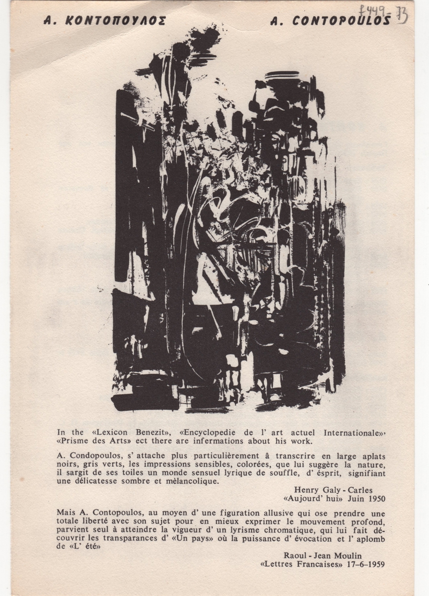 Έντυπο έκθεσης, ελληνικά και γαλλικά, μονόφυλλο, χαρτόνι, 21,3×14,5 εκ. Απόκομμα εντύπου έκθεσης (;) με βιογραφικό καλλιτέχνη και αποσπάσμα κριτικών του Henry Galy-Carles και Raoul-Jean Moulin. Εικονογραφείται με αναπαραγωγή έργου.