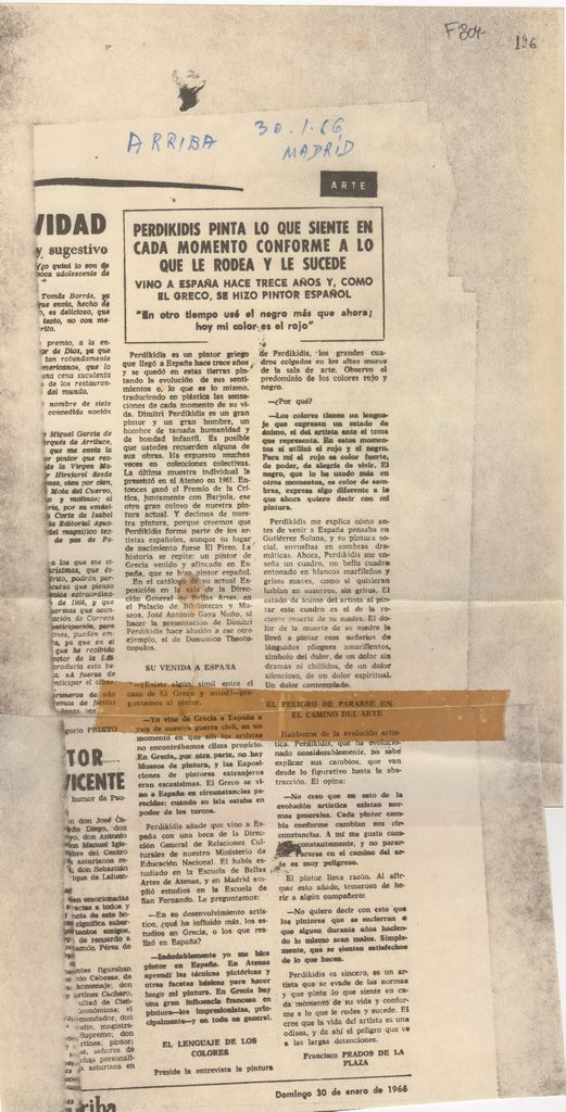 Φωτοαντίγραφο, χαρτί, 39×22 εκ., στα ισπανικά, δημοσίευσης συνέντευξης του Δημήτρη Περδικίδη.