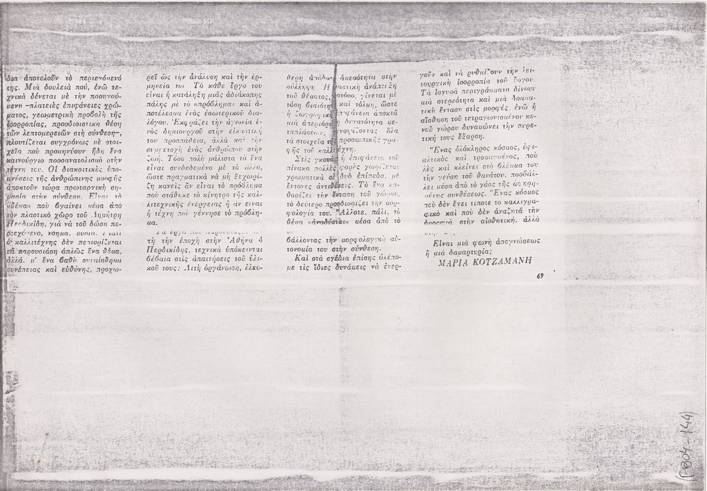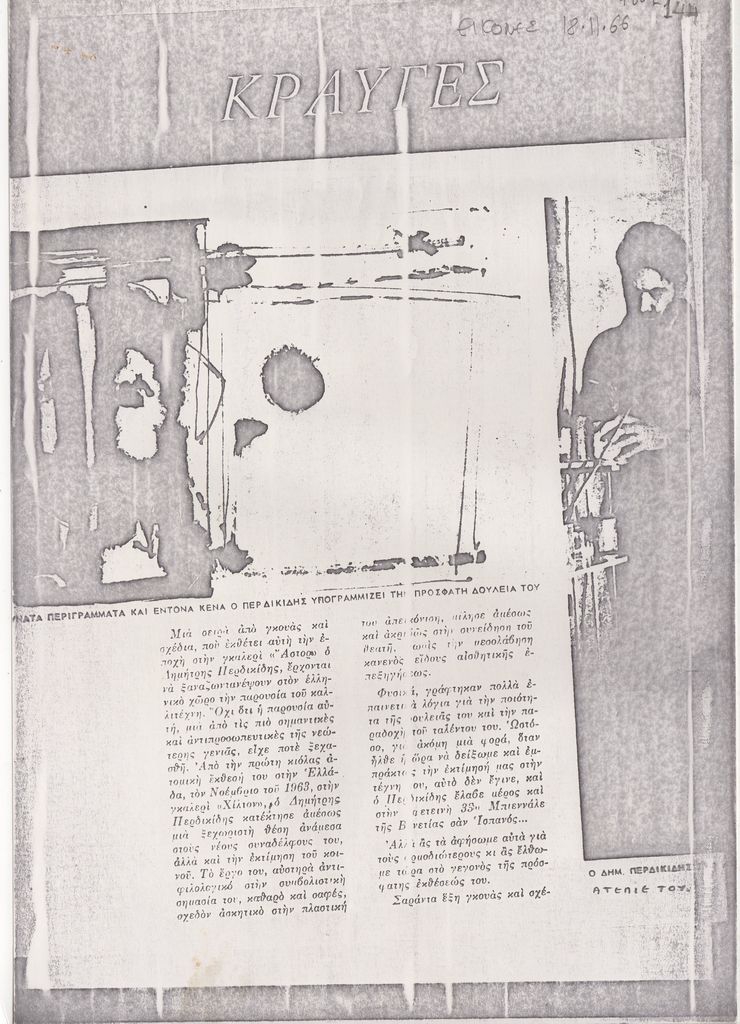 Φωτοαντίγραφο, χαρτί, 3 φφ, 29.5×21 εκ., στα ελληνικά, δημοσίευσης κριτικής έκθεσης του Δημήτρη Περδικίδη, η οποία διεξάγεται στην Γκαλερί Άστορ στην Αθήνα.