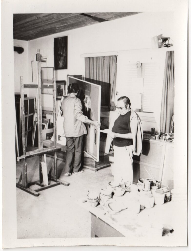 Φωτογραφία, α/μ, σε φωτογραφικό χαρτί, 12,0×9,0 εκ. Ο Τώνης Σπητέρης με τον ζωγράφο Αλέκο Κοντόπουλο στο εργαστήριο του καλλιτέχνη.