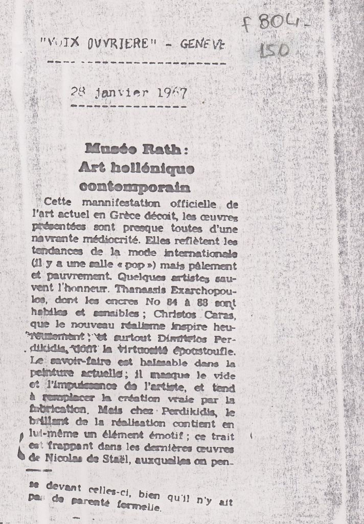 Φωτοαντίγραφο, χαρτί, 29.5×21 εκ., στα γαλλικά, δημοσίευσης κριτικής ομαδικής έκθεσης Ελλήνων καλλιτεχνών στο Musée Rath στην Γενεύη. Σχολιάζεται ειδικότερα το έργο των Θανάση Εξαρχόπουλου, Χρίστου Καρά και Δημήτρη Περδικίδη.