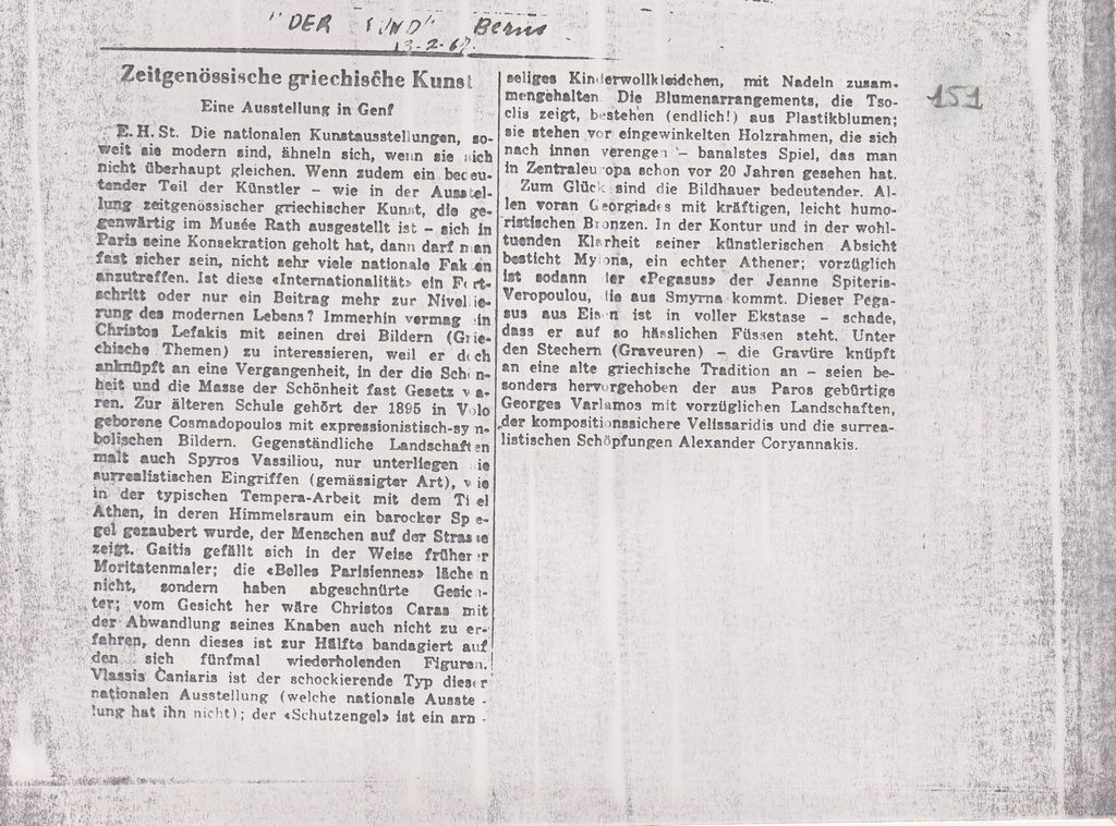 Φωτοαντίγραφο, χαρτί, 29.5×21 εκ., στα γερμανικά, δημοσίευσης άρθρου, αναφερόμενου σε ομαδική έκθεση Ελλήνων καλλιτεχνών, η οποία διεξάγεται στο Musée Rath στην Γενεύη.