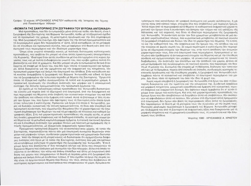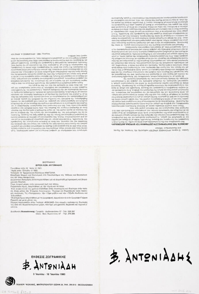 Αντωνιάδης Β. : Έκθεσις ζωγραφικής του Β. Αντωνιάδη, Γκαλερί "Κοχλίας", Θεσσαλονίκη, 03/06/1980 - 16/06/1980