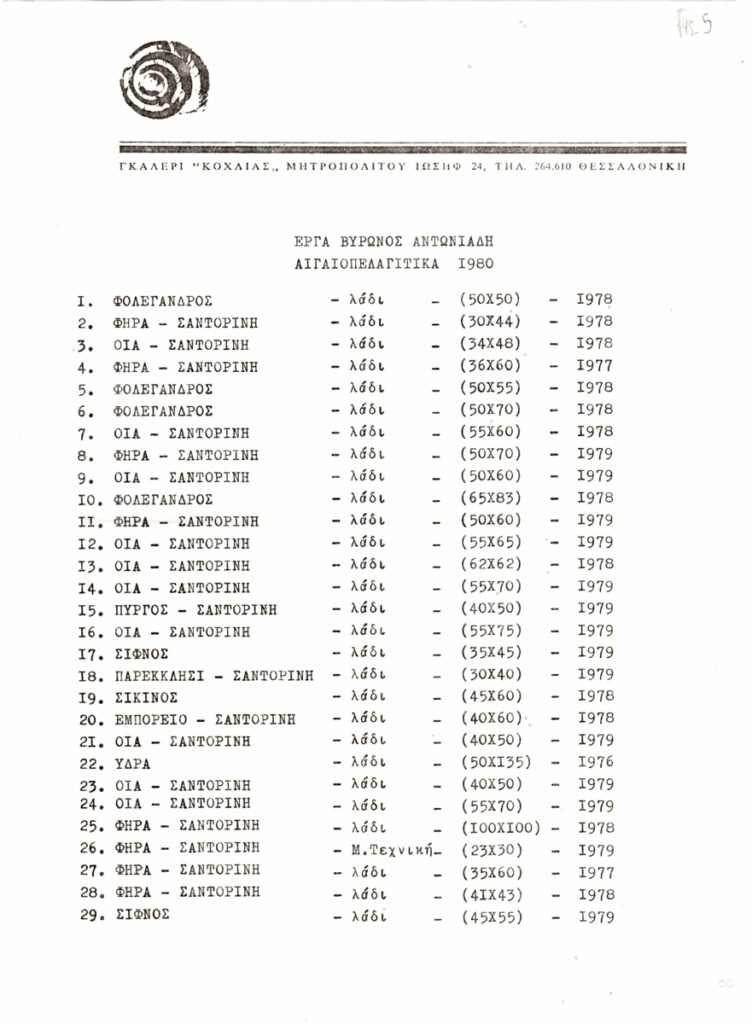 Κατάλογος έργων, χαρτί, 30×21εκ, στα ελληνικά, με τίτλο “Έργα Βύρωνος Αντωνιάδη Αιγαιοπελαγίτικα 1980”, έκθεσής του στην γκαλερί Κοχλίας στη Θεσσαλονίκη. Εμπεριέχονται 29 έργα, για τα οποία δίνεται ο τίτλος, η τεχνική, οι διαστάσεις και η χρονολογία δημιουργίας τους.