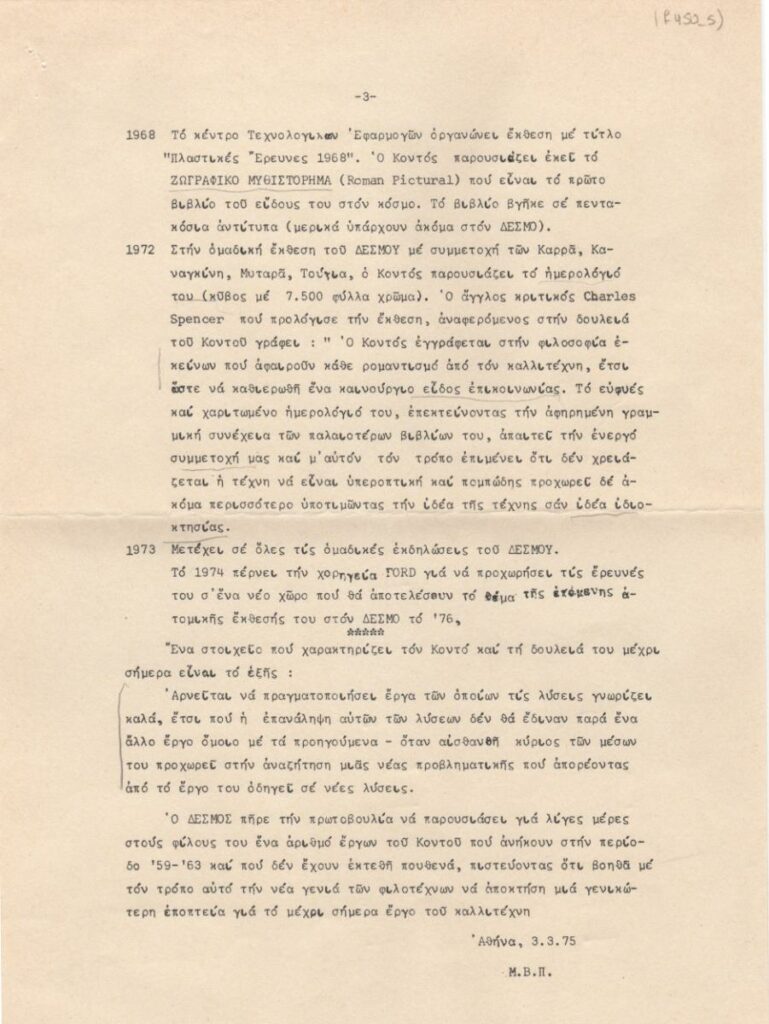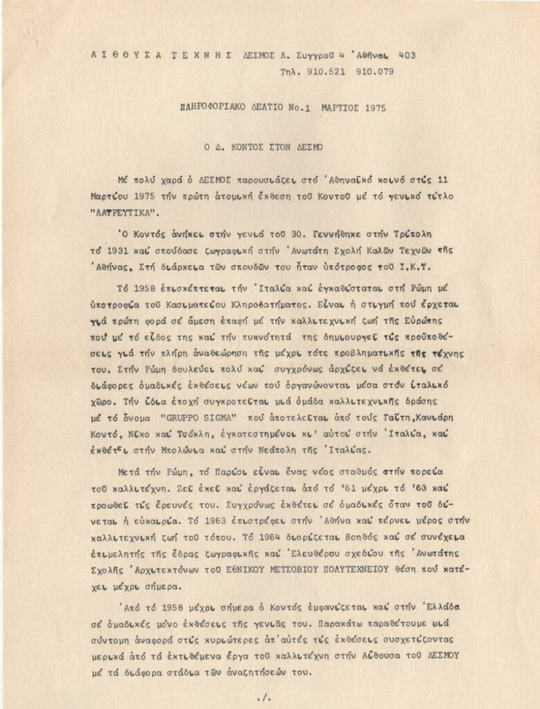Πληροφοριακό δελτίο (αρ. 1) της Αίθουσας Τέχνης Δεσμός με θέμα την ατομική έκθεση ζωγραφικής του Δημήτρη Κοντού. Περιέχει πληροφορίες για τον καλλιτέχνη και την έκθεση και κατάλογο των εκτιθέμενων έργων.
