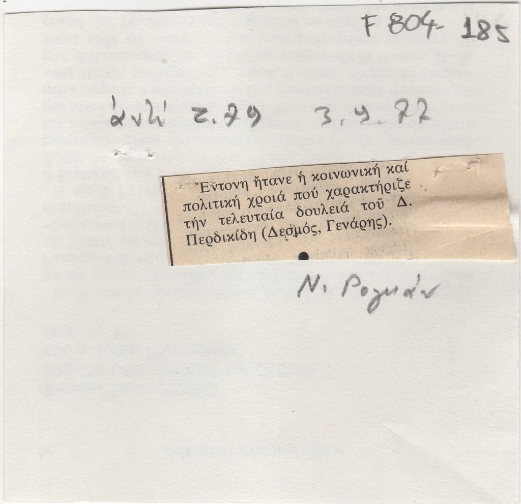 Απόκομμα, χαρτί συρραμμένο σε έντυπο, 9.5×9.5 εκ., στα ελληνικά, δημοσίευσης συνοπτικής κριτικής έκθεσης του Δημήτρη Περδικίδη, η οποία διεξάγεται στην Αίθουσα Τέχνης Δεσμός στην Αθήνα.