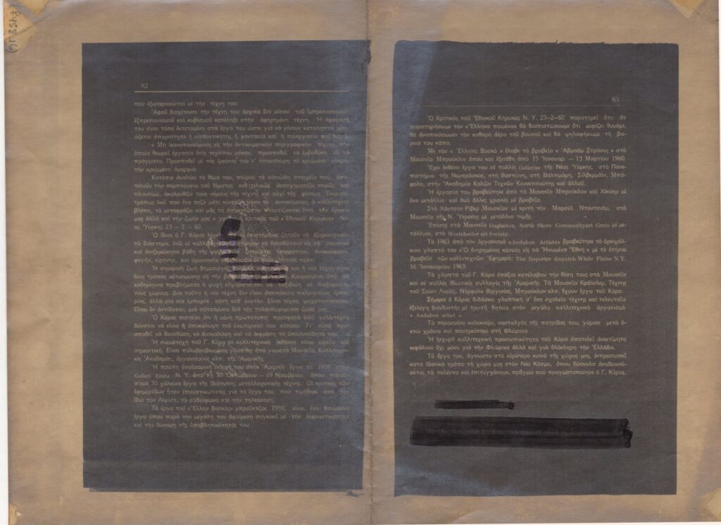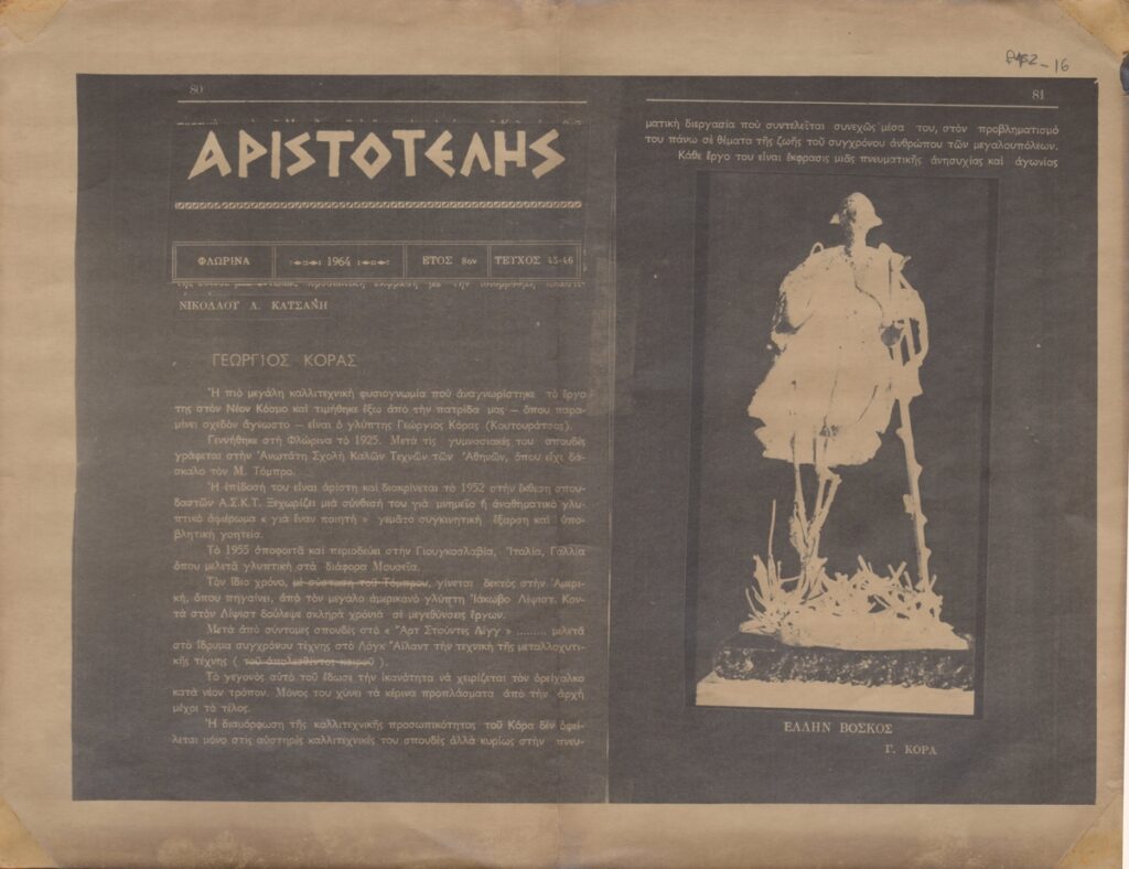 Φωτοαντίγραφο, χαρτί, 2 φφ, 21,5×28 εκ., στα ελληνικά, δημοσίευσης άρθρου για τη ζωή και το έργο του Γιώργου Κόρα.