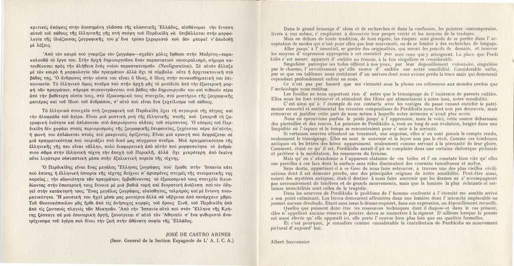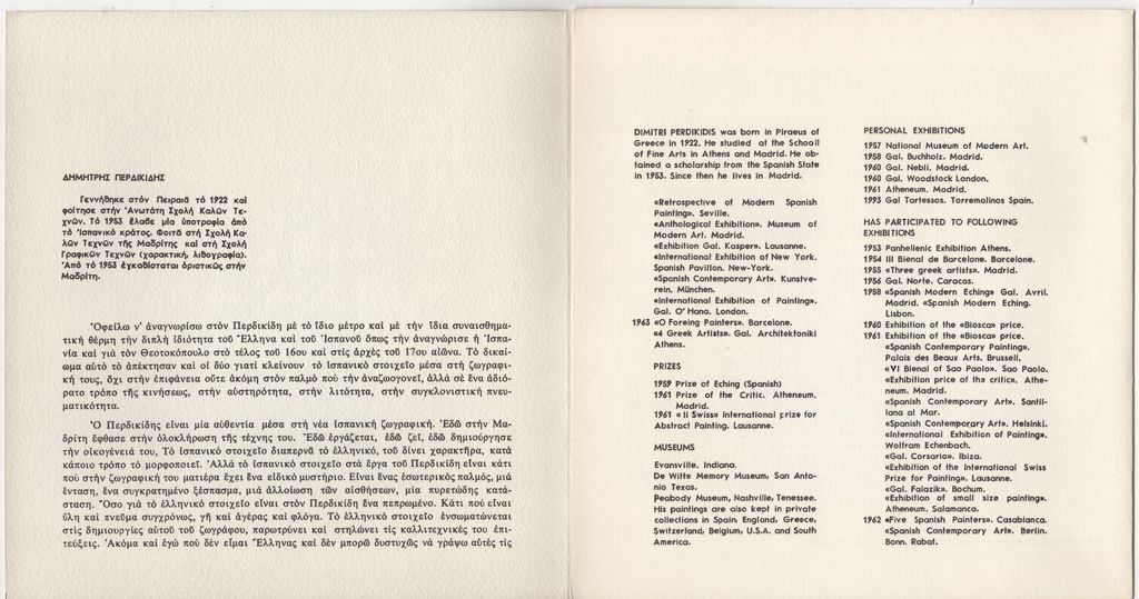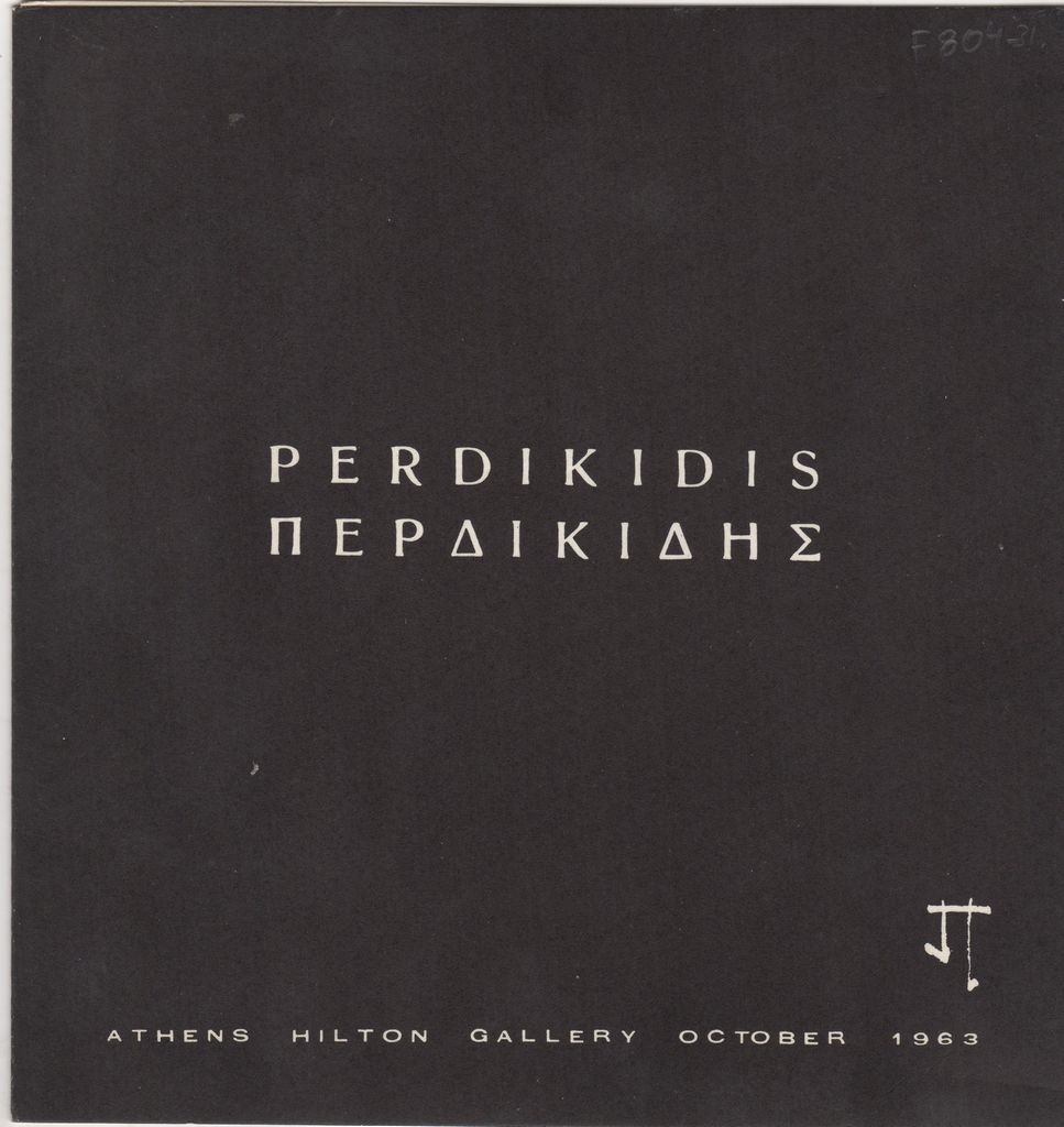 Έντυπο, χαρτόνι τρίπτυχο, 20.5×19.5 εκ., στα ελληνικά, αγγλικά και γαλλικά, ατομικής έκθεσης του Δημήτρη Περδικίδη, στην Athens Hilton Gallery τον Οκτώβρη 1963. Το έντυπο περιέχει βιογραφικό σημείωμα, κείμενα- κριτικές για το έργο του καλλιτέχνη και εικονογράφηση.