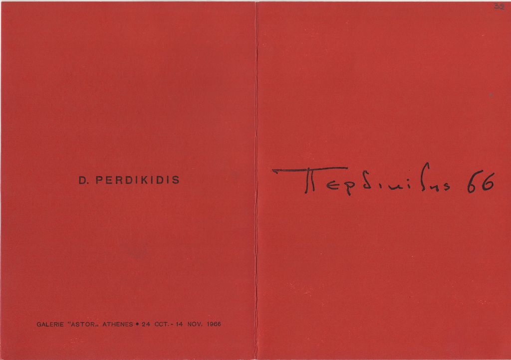 Έντυπο, χαρτόνι τρίπτυχο, 21×15 εκ., στα ελληνικά και γαλλικά, ατομικής έκθεσης του Δημήτρη Περδικίδη, η οποία διεξάγεται στην Γκαλερί Άστορ στην Αθήνα.