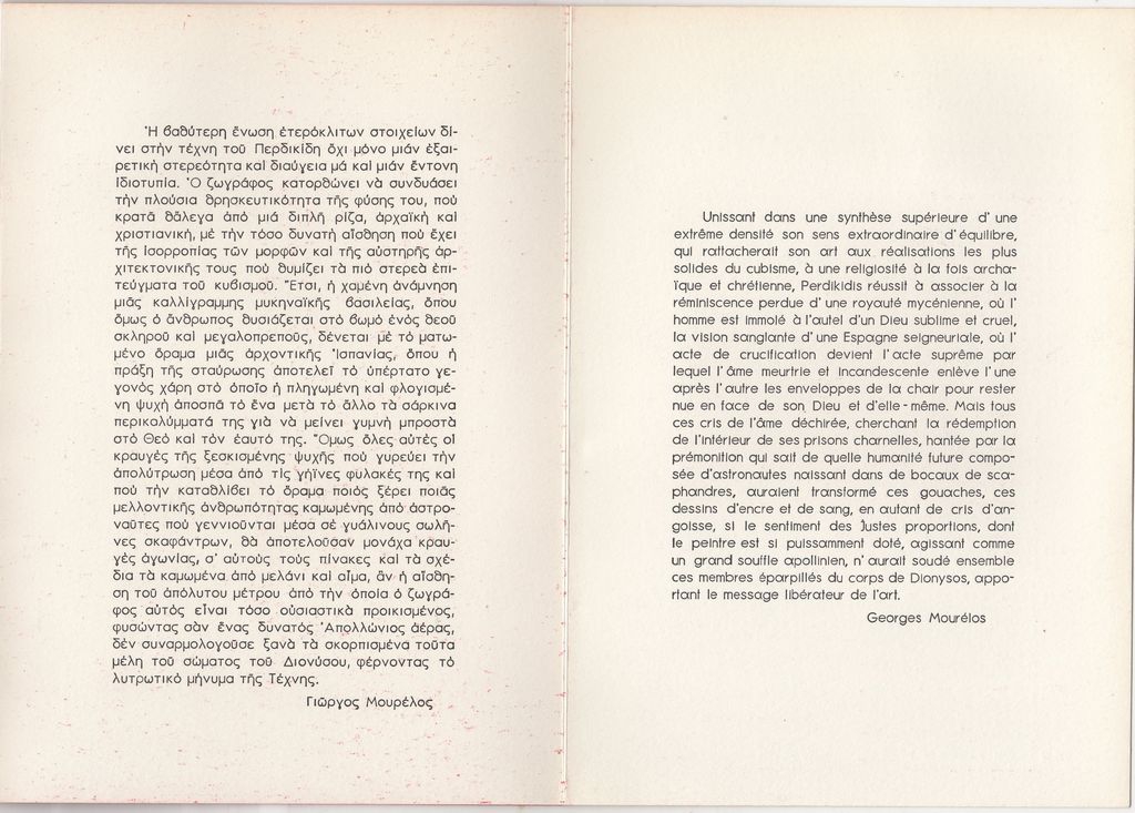 Το έντυπο περιέχει βιογραφικό σημείωμα, κείμενο- κριτική του Γιώργου Μουρέλου για το καλλιτέχνικό έργο του Περδικίδη και εικονογράφηση.