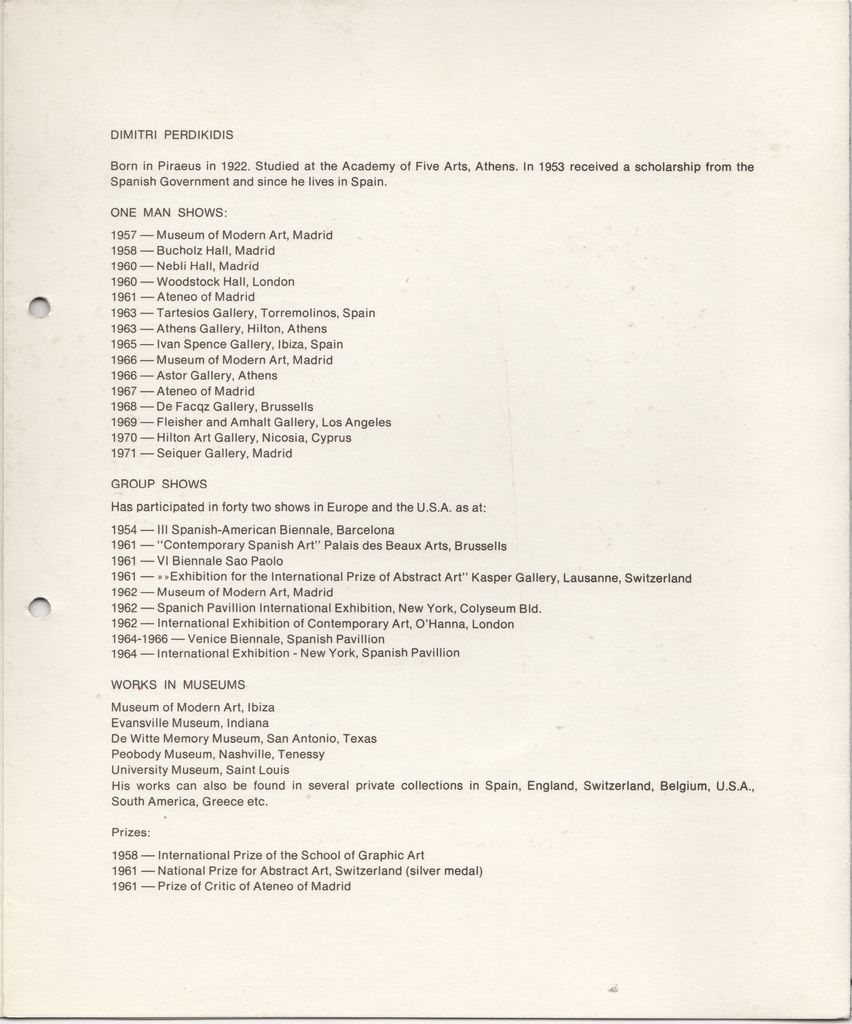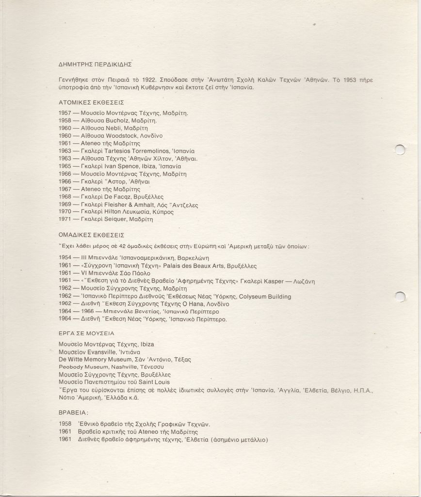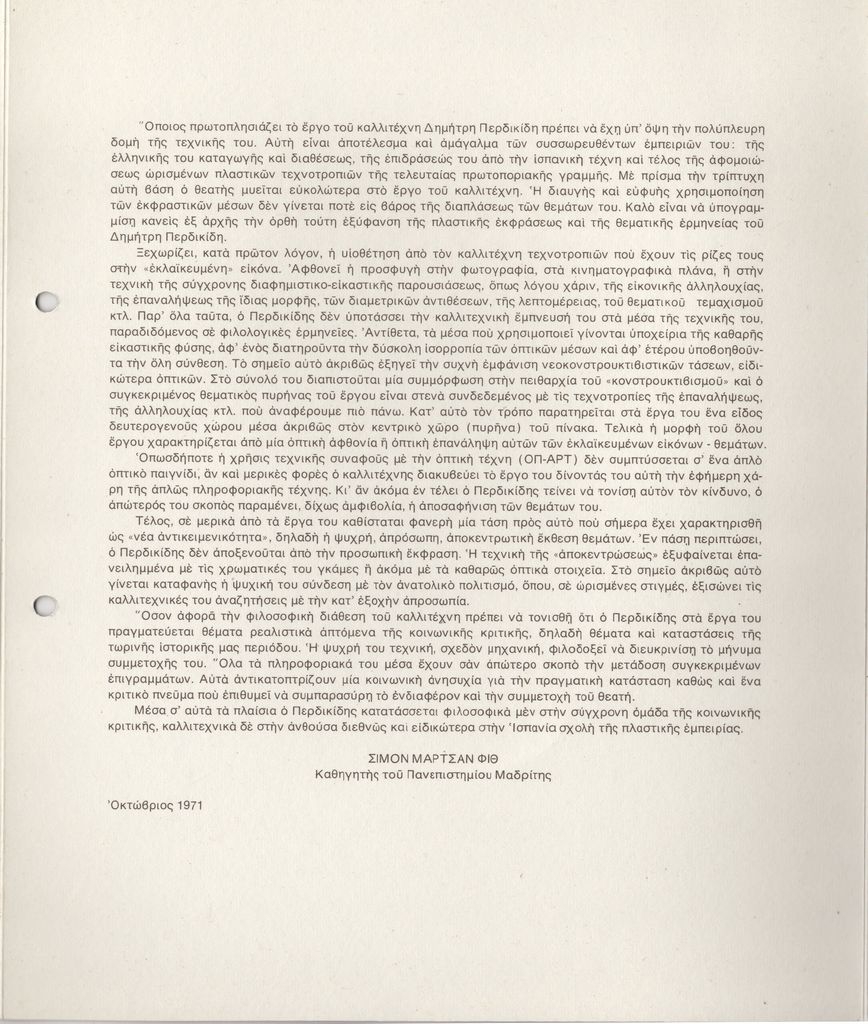 Έντυπο, χαρτόνι δίπτυχο, 27×22,5 εκ., στα ελληνικά και σε αγγλική μετάφραση, ατομικής έκθεσης του Δημήτρη Περδικίδη, η οποία διεξάγεται στην Αίθουσα Τέχνης Αθηνών Χίλτον τον Νοέμβρη 1971.