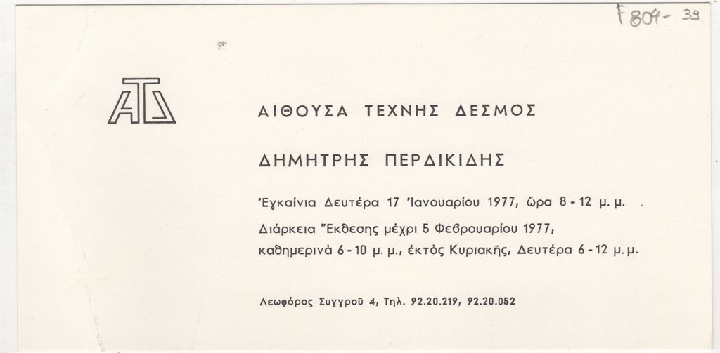 Πρόσκληση, χαρτόνι, 10×20 εκ., στα ελληνικά, ατομικής έκθεσης του Δημήτρη Περδικίδη, η οποία διεξάγεται στην Αίθουσα Τέχνης Δεσμός, στην Αθήνα.