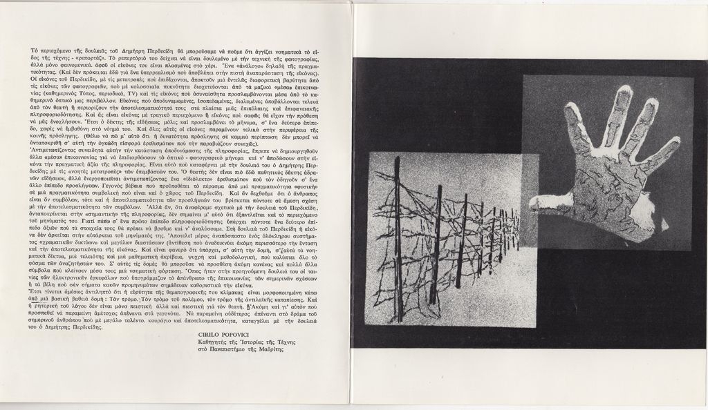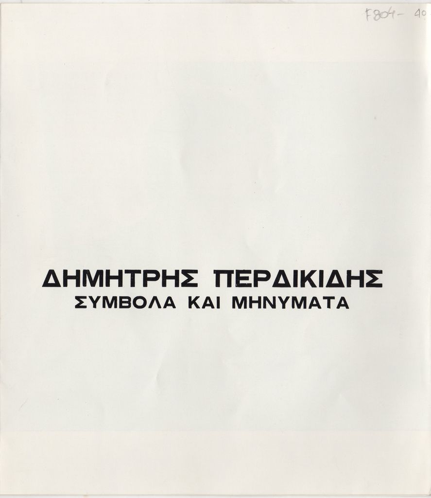 Έντυπο, χαρτί ιλλουστρασιόν δίπτυχο, 21,5×19 εκ., στα ελληνικά, ατομικής έκθεσης του Δημήτρη Περδικίδη, η οποία διεξάγεται στην Αίθουσα Τέχνης Δεσμός, στην Αθήνα.