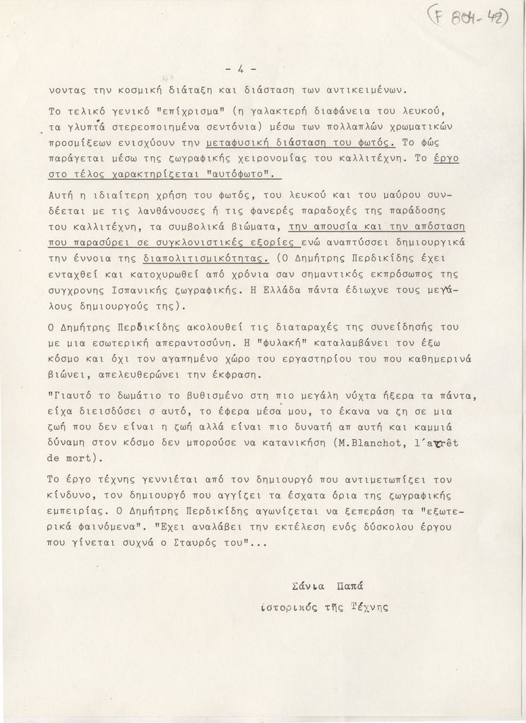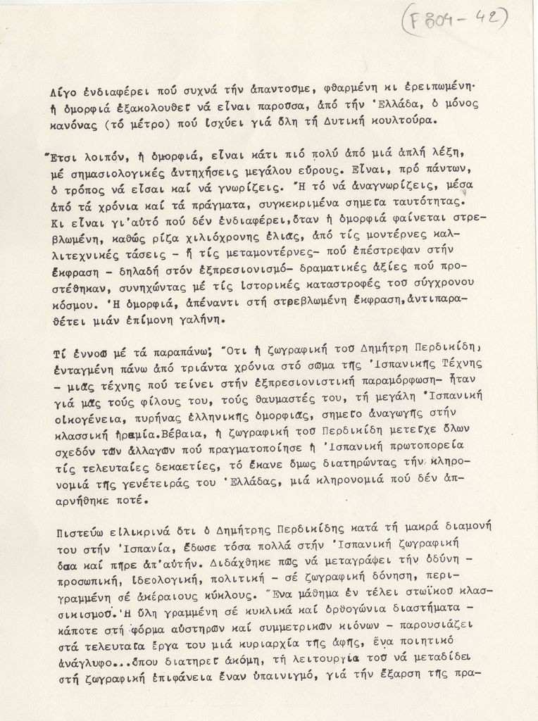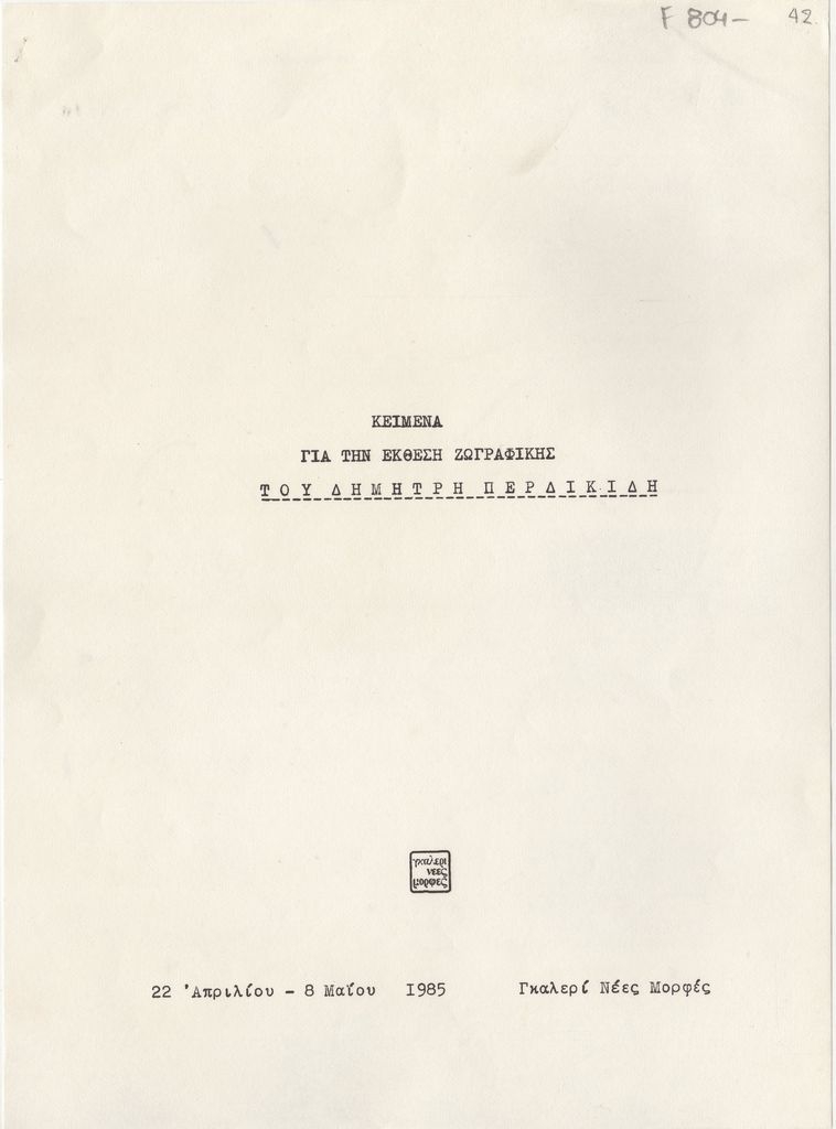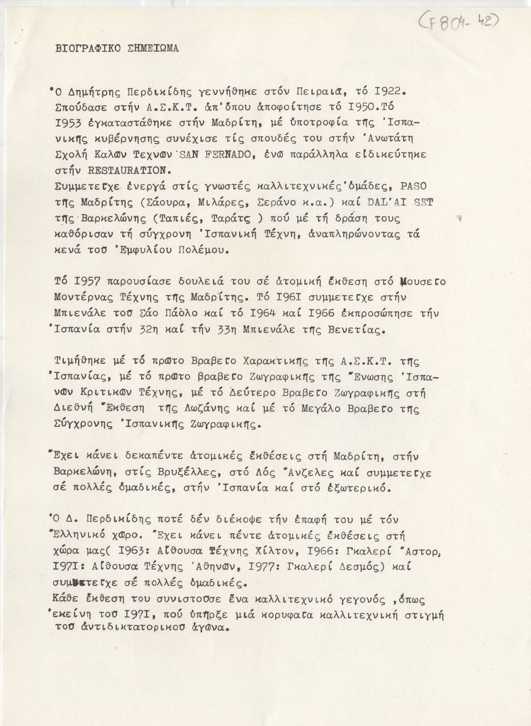 Φωτοαντίγραφο δακτυλόγραφου εντύπου, χαρτί, 8 φφ, 29×21 εκ., στα ελληνικά, με πλήρη τίτλο “Κείμενα για την έκθεση ζωγραφικής του Δημήτρη Περδικίδη”, στο πλαίσιο έκθεσης του καλλιτέχνη στην γκαλερί Νέες Μορφές, στην Αθήνα.