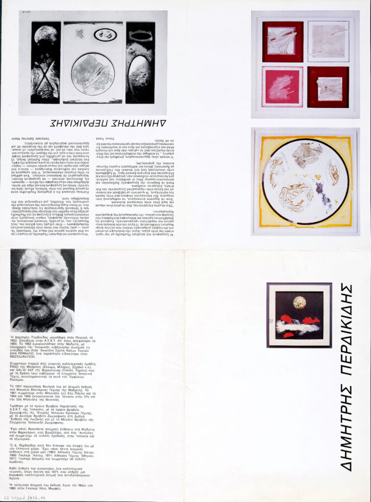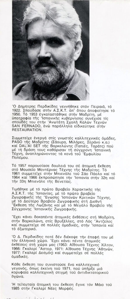 Έντυπο έκθεσης του Δημήτρη Περδικίδη στην Γκαλερί Νέες Μορφές, στην Αθήνα.