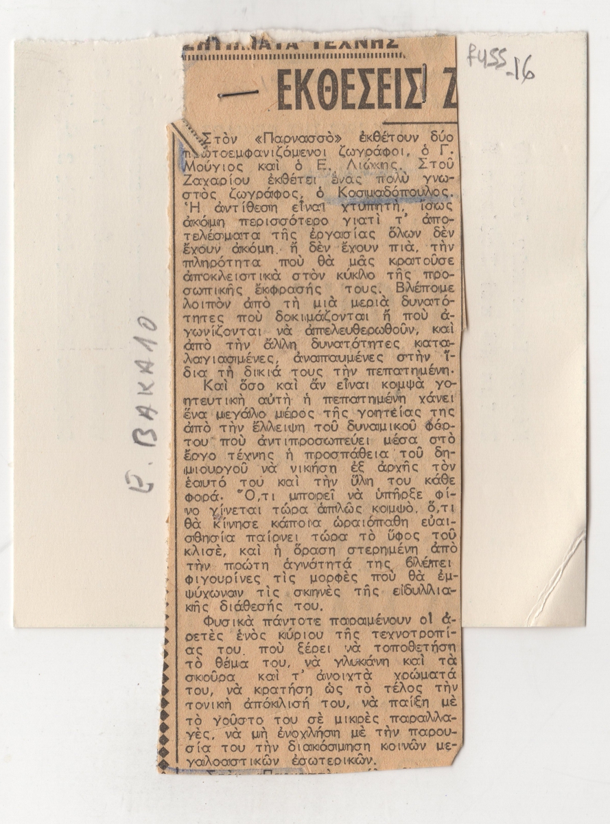 Απόκομμα, χαρτί συρραμμένο σε απόκομμα εντύπου, 12,5×9,5 εκ., στα ελληνικά, δημοσίευσης κριτικής εκθέσεων των Γ. Κοσμαδόπουλου, Ε. Λιώκη και Γ. Μούγιου στην Αθήνα. Εντάσσεται στη στήλη του εντύπου “Ζητήματα Τέχνης”. Το απόκομμα φέρει επιγραφές.