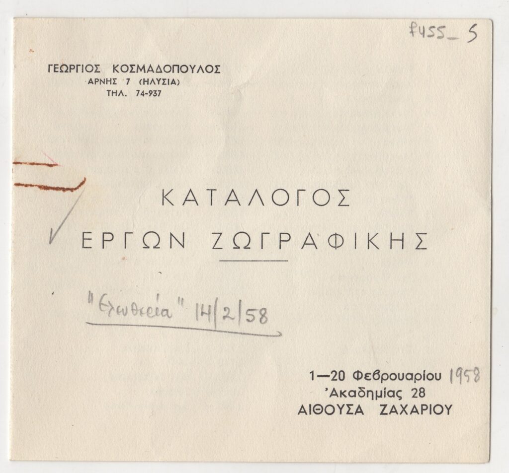 Τιμοκατάλογος, χαρτί αναδιπλωμένο, 11,5×12,5 εκ., στα ελληνικά και σε γαλλική μετάφραση, έργων ατομικής έκθεσης ζωγραφικής του Γιώργου Κοσμαδόπουλου.