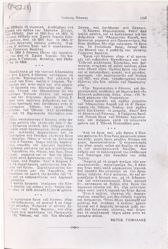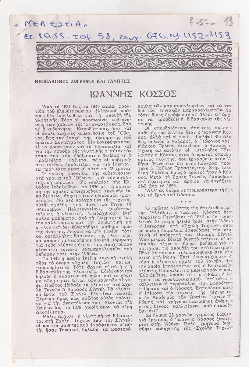 Φωτοαντίγραφο, χαρτί, 2 φφ, 17×11 εκ., στα ελληνικά, δημοσίευσης άρθρου για τη ζωή και το έργο του Ιωάννη Κόσσου. Εντάσσεται στη στήλη “Νεοέλληνες Ζωγράφοι και Γλύπτες” του εντύπου.