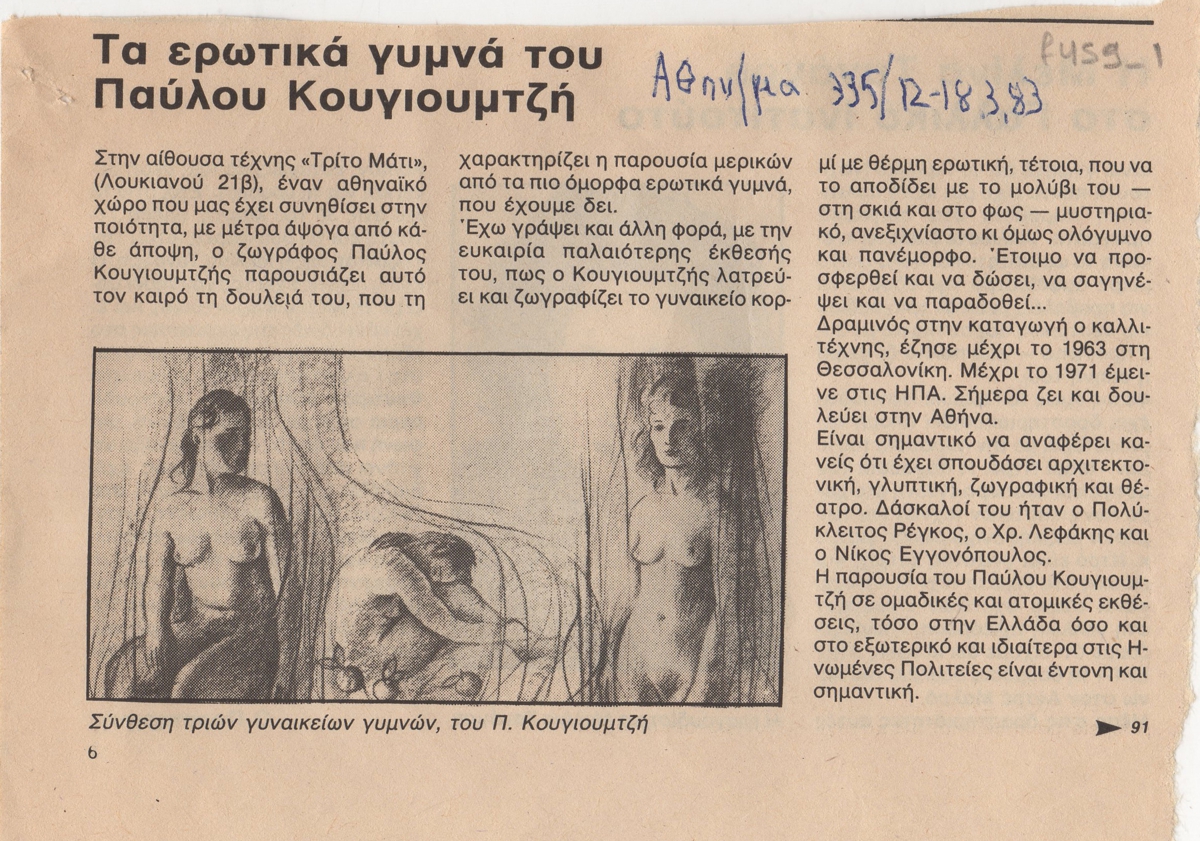 Απόκομμα, χαρτί, 2 φφ, 10,5×15 και 6×15 εκ., στα ελληνικά, δημοσίευσης κριτικής έκθεσης του Παύλου Κουγιουμτζή, η οποία διεξάγεται στην Αίθουσα “Το Τρίτο Μάτι” στην Αθήνα.