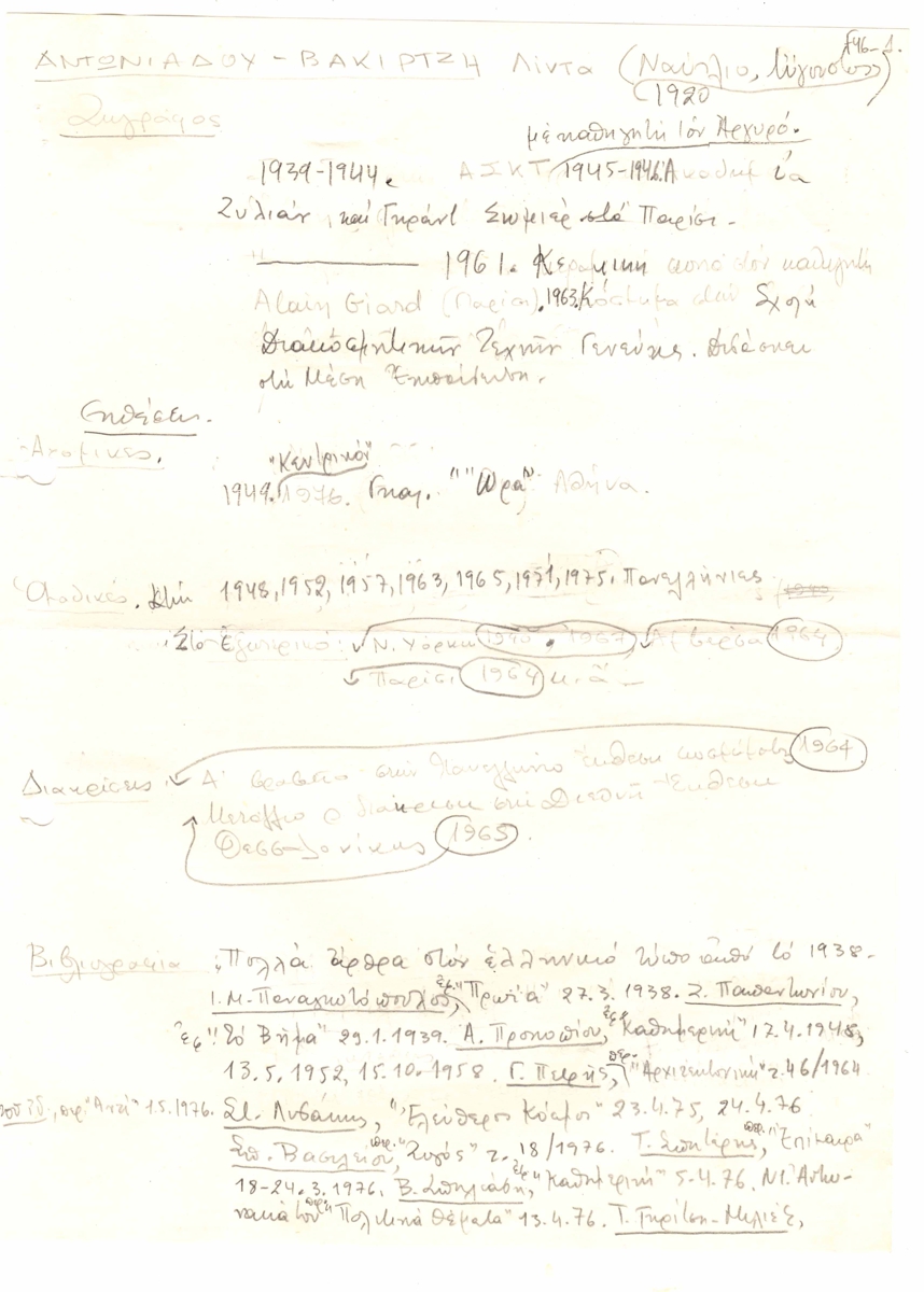 Βιογραφικό, χειρόγραφο με μολύβι, 2 φφ, 29×21εκ, στα ελληνικά, της Λίντας Αντωνιάδου-Βακιρτζή. Περιέχει προσωπικά στοιχεία, λίστα ατομικών και ομαδικών εκθέσεων, διακρίσεις και βιβλιογραφία.