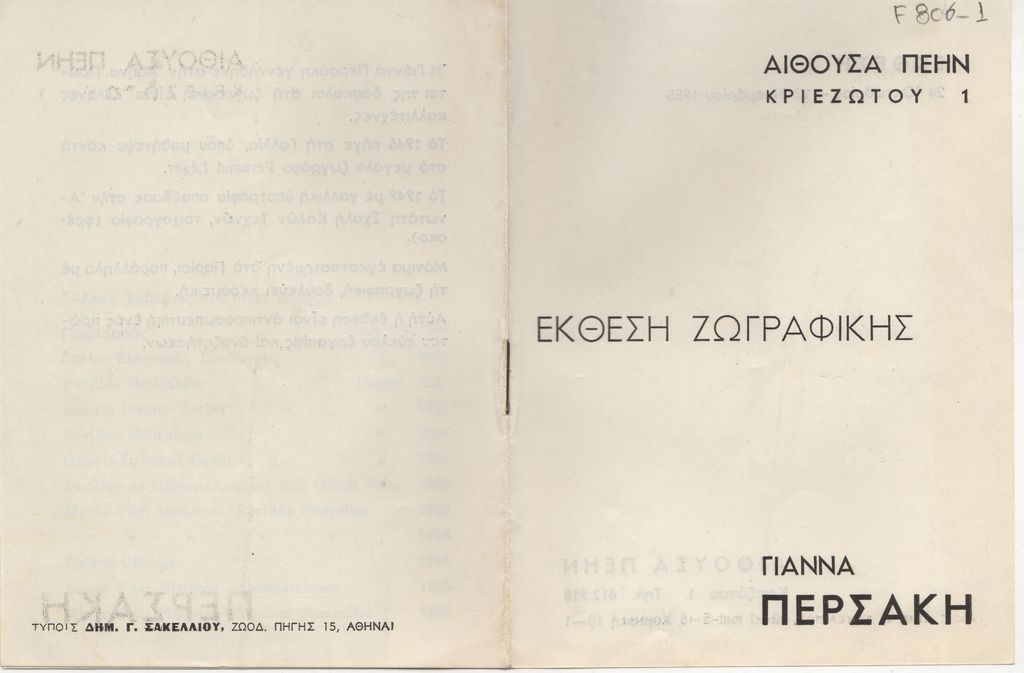 Έντυπο, χαρτί, 4 φφ, 16×12 εκ., στα ελληνικά, ατομικής έκθεσης της Γιάννας Περσάκη, η οποία διεξάγεται στην Αίθουσα Μόνικας Πέην στην Αθήνα.