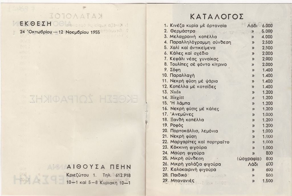 Περιέχει τιμοκατάλογο έργων, βιογραφικό σημείωμα και εικονογράφηση.