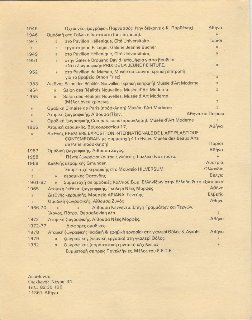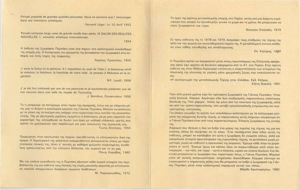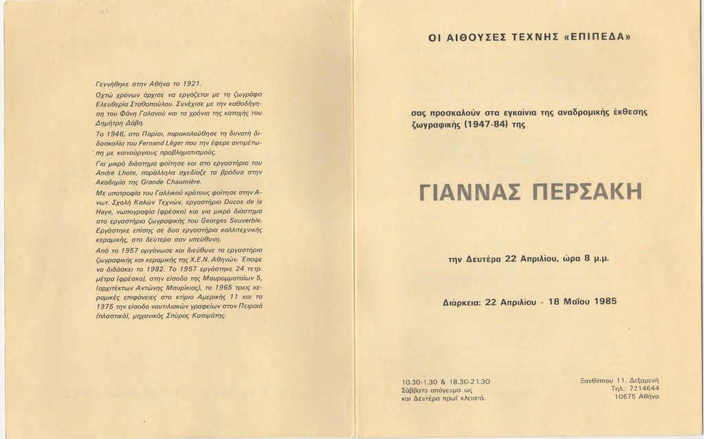 Έντυπο, χαρτόνι δίπτυχο, 24×19 εκ., στα ελληνικά, αναδρομικής έκθεσης της Γιάννας Περσάκη, στις Αίθουσες Τέχνης Επίπεδα στην Αθήνα. Το έντυπο περιέχει βιογραφικό σημείωμα, αποσπάσματα κριτικών για το έργο της και πρόσκληση εγκαινίων στην έκθεση.