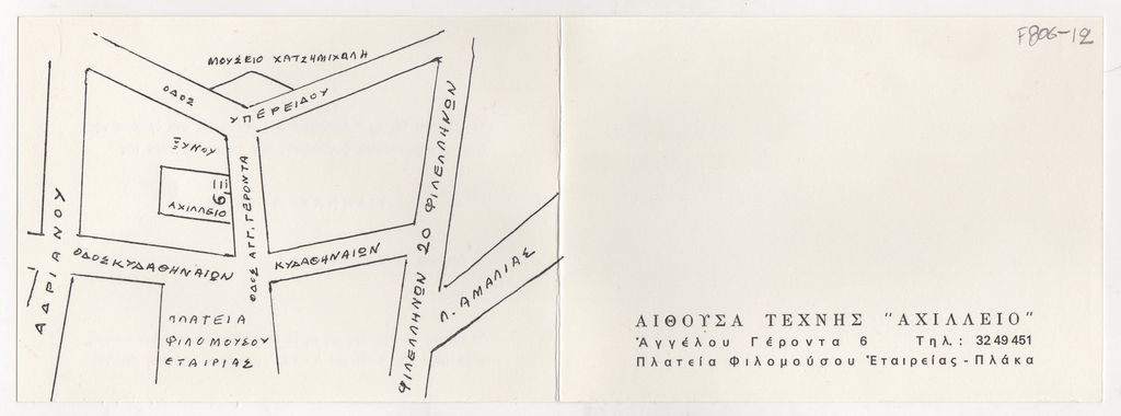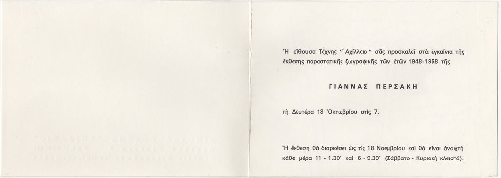 Πρόσκληση, χαρτόνι αναδιπλωμένο, 10,5×15 εκ., στα ελληνικά, εγκαινίων έκθεσης της Γιάννας Περσάκη, στην Αίθουσα Τέχνης “Αχίλλειο” στην Αθήνα.