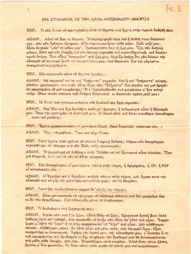 Έντυπο, χαρτί, 28,5×21εκ, στα ελληνικά, που περιλαμβάνει συνέντευξη της Λίντας Αντωνιάδου-Βακιρτζή, στην οποία μιλάει για το έργο της.