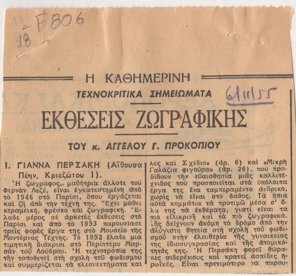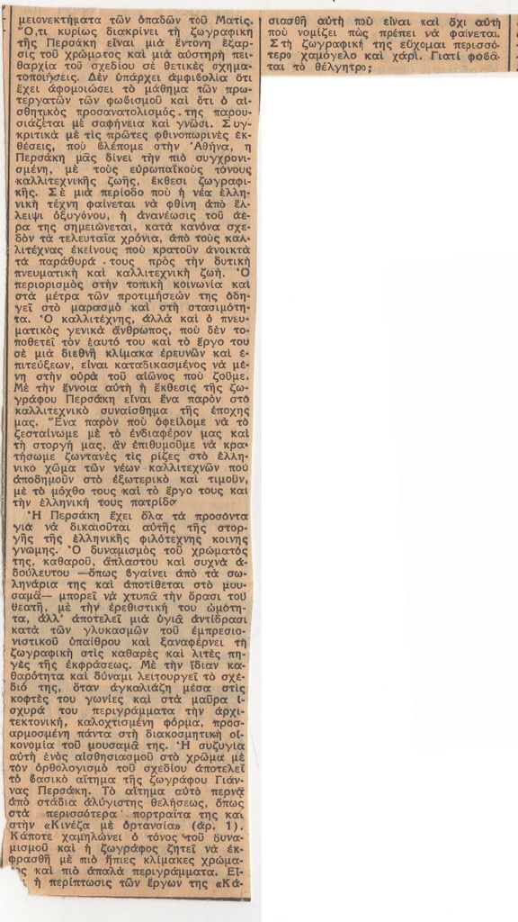 Απόκομμα, χαρτί, 2 φφ ακανόνιστου μεγέθους, στα ελληνικά, δημοσίευσης κριτικής έκθεσης της Γιάννας Περσάκη, η οποία διεξάγεται στην Αίθουσα Πέην στην Αθήνα.