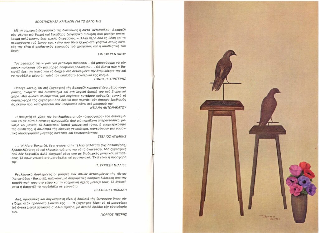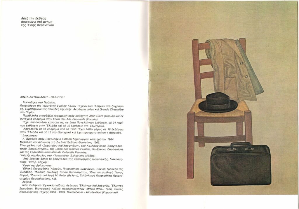 Έντυπο, χαρτόνι, 2 φφ, 24×17εκ, στα ελληνικά, έκθεσης της Λίντας Αντωνιάδου-Βακιρτζή, στο Καλλιτεχνικό Πνευματικό Κέντρο Ώρα. Το έντυπο περιλαμβάνει βιογραφικό σημείωμα, κείμενο του Στέλιου Λυδάκη και αποσπάσματα κριτικών για το έργο της από τους Έφη Φερεντίνου, Τώνη Σπητέρη, Ντιάνα Αντωνακάτου, Στέλιο Λυδάκη, Τ. Γκρίτση-Μιλλιέξ, Βεατρίκη Σπηλιάδη, Γιώργο Πετρή. Σημειώνεται επίσης πως η έκθεση είναι αφιερωμένη στην Έφη Φερεντίνου, ενώ υπάρχει και εικονογράφηση.