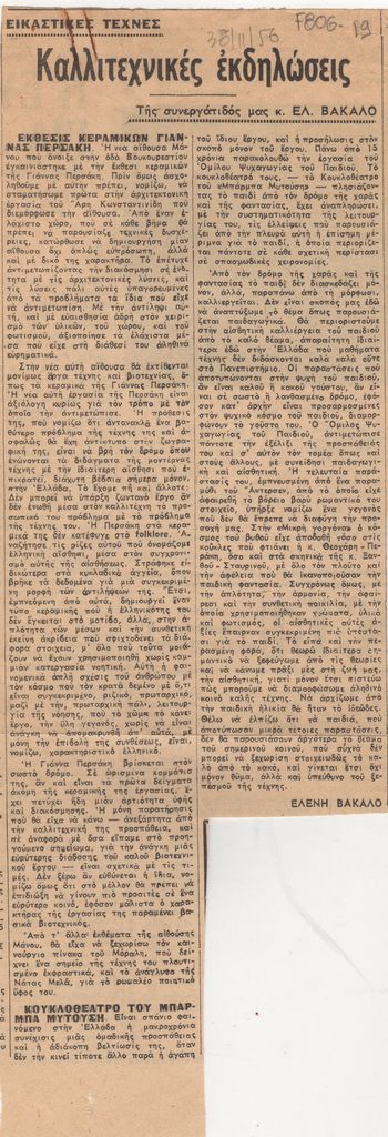 Απόκομμα, χαρτί ακανόνιστου μεγέθους, στα ελληνικά, δημοσίευσης κριτικής έκθεσης της Γιάννας Περσάκη, η οποία διεξάγεται στην Αίθουσα Μάνου στην Αθήνα.