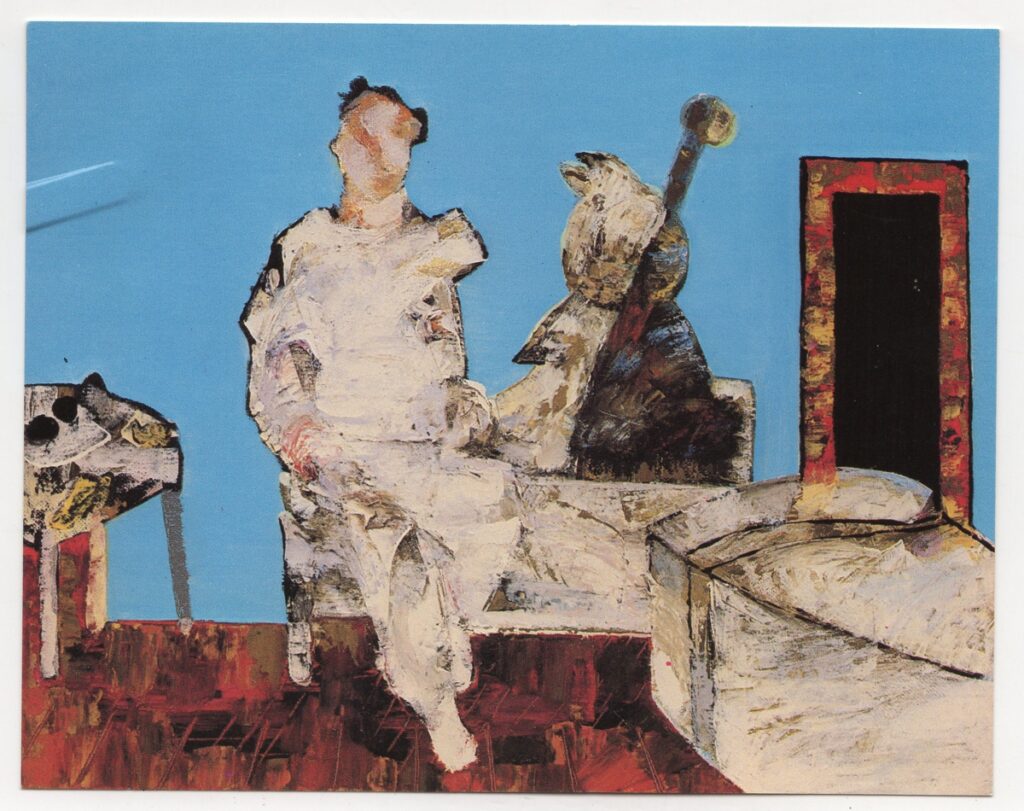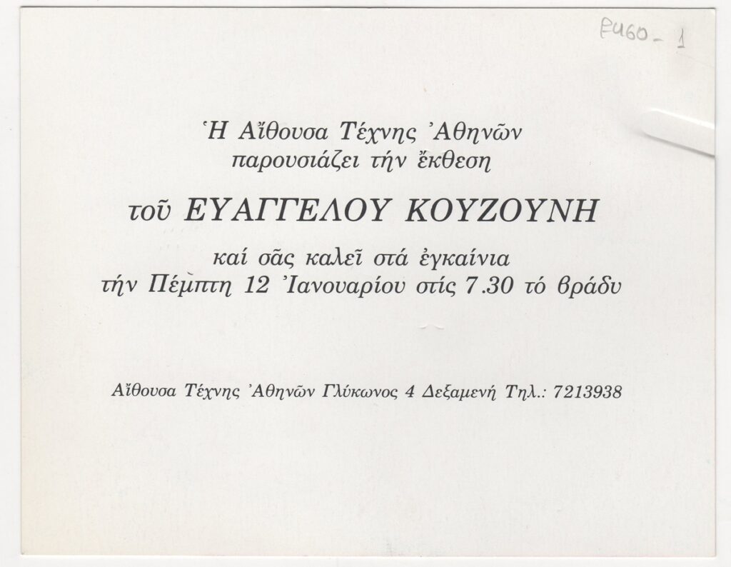 Πρόσκληση, χαρτί ιλλουστρασιόν διπλής όψης, 11×14 εκ., στα ελληνικά, ατομικής έκθεσης ζωγραφικής του Ευάγγελου Κουζούνη.