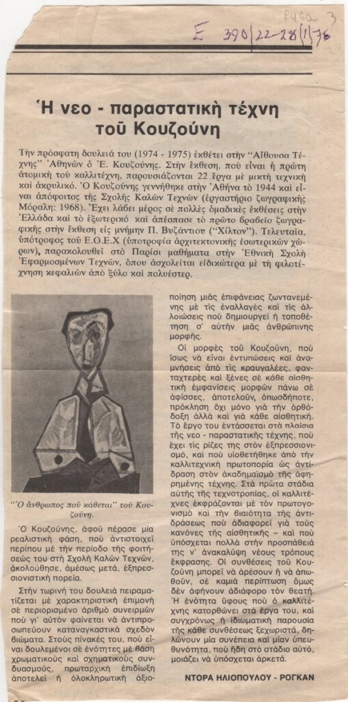 Απόκομμα, χαρτί, 24×12 εκ., στα ελληνικά, δημοσίευσης κριτικής έκθεσης του Ευάγγελου Κουζούνη, η οποία διεξάγεται στην Αίθουσα Τέχνης Αθηνών.