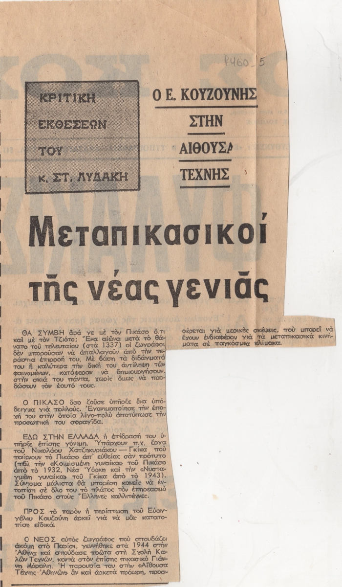 Απόκομμα, χαρτί ακανόνιστου μεγέθους, δημοσίευσης κριτικής έκθεσης του Ευάγγελου Κουζούνη, η οποία διεξάγεται στην Αίθουσα Τέχνης Αθηνών. Εντάσσεται σε ομώνυμη στήλη του εντύπου.