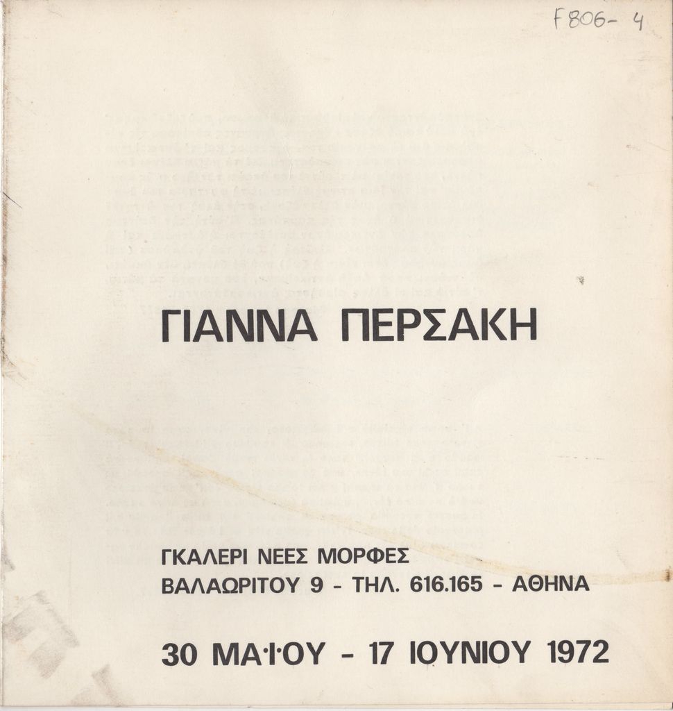 Έντυπο, χαρτόνι αναδιπλωμένο, 22×21 εκ., στα ελληνικά και ιταλικά, ατομικής έκθεσης της Γιάννας Περσάκη, στην γκαλερί Νέες Μορφές, στην Αθήνα.