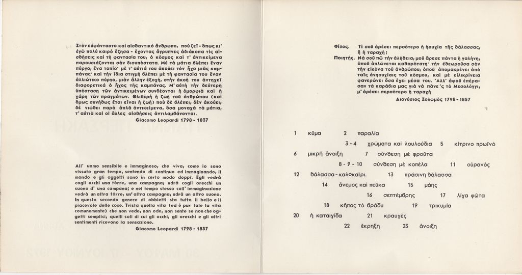 Περιέχει αποσπάσματα ποιημάτων του Giacomo Leopardi και Διονύσιου Σολωμού και κατάλογο των εκτιθέμενων έργων.