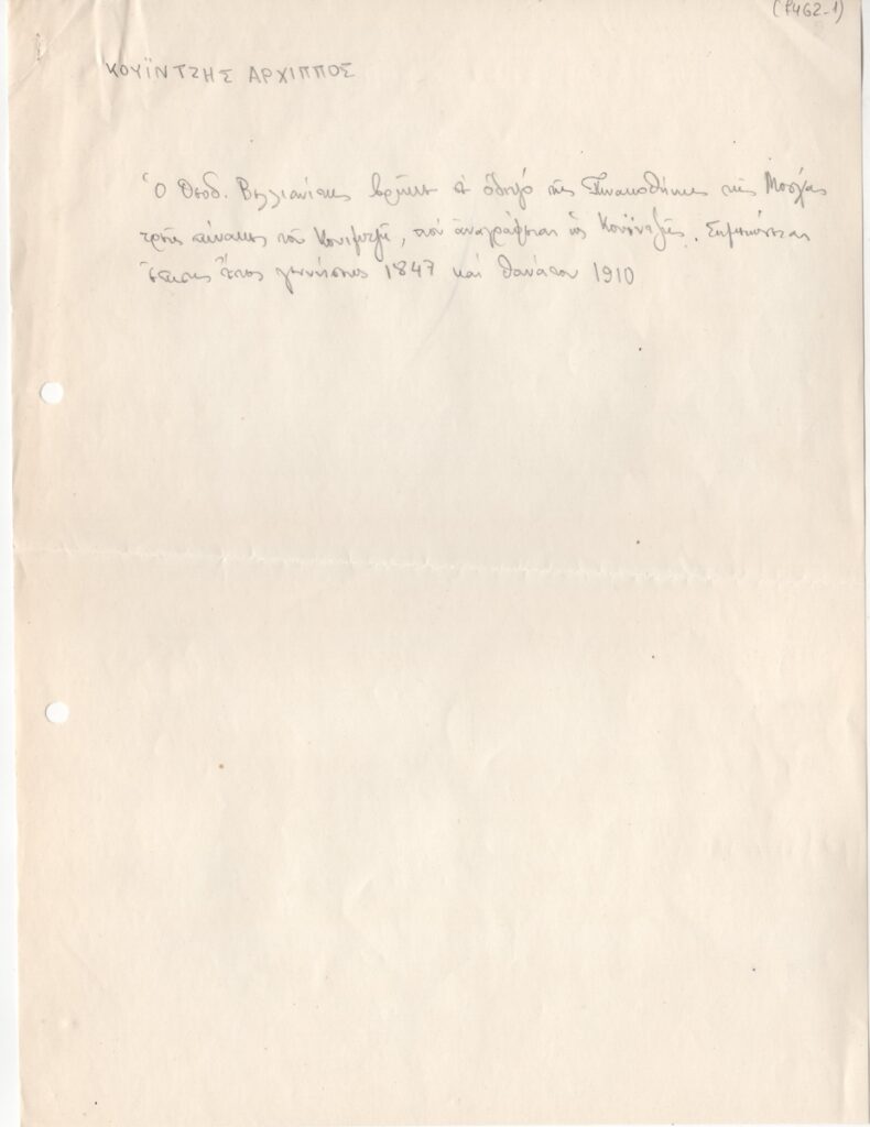 Κείμενο, χειρόγραφο, με μολύβι και κόκκινη ξυλομπογιά, στα ελληνικά, σε χαρτί, 2 φφ., 28,5×21,5 εκ. Σύντομα βιογραφικά στοιχεία του ελληνικής καταγωγής ζωγράφου Άρχιππου Κουιντζή. Δίνονται πληροφορίες για τις σπουδές του, έργα, εκθέσεις και βιβλιογραφία.