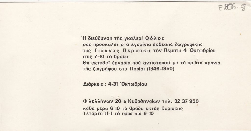 Πρόσκληση, χαρτόνι, 9,5×18,5 εκ., στα ελληνικά, εγκαινίων έκθεσης ζωγραφικής της Γιάννας Περσάκη, στην γκαλερί Θόλος, στην Αθήνα.