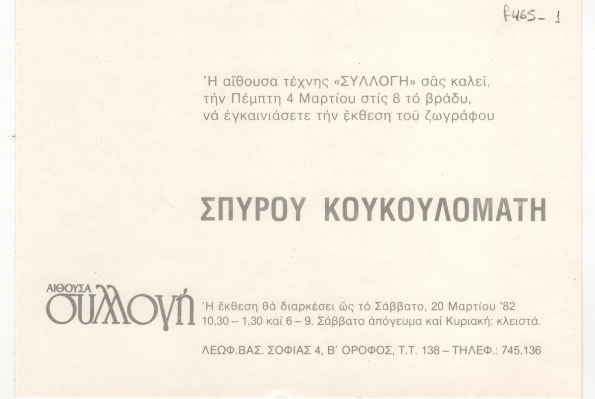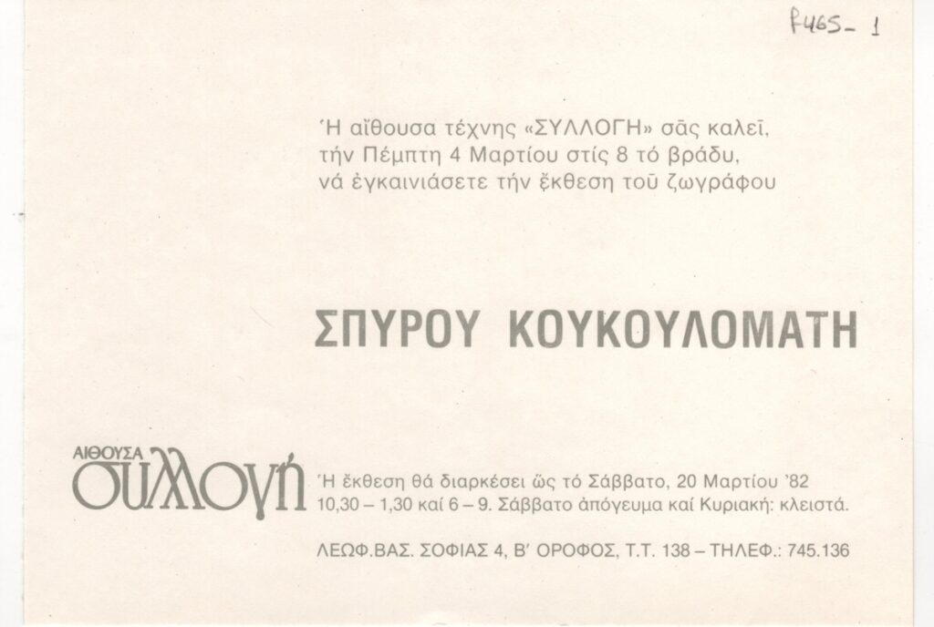 Έντυπο έκθεσης, στα ελληνικά, μονόφυλλο, σε χαρτόνι ιλουστρασιόν, 12,3×17,2 εκ. Πρόσκληση της ατομικής έκθεσης ζωγραφικής του Σπύρου Κουκουλομάτη στην Αθήνα το 1982.