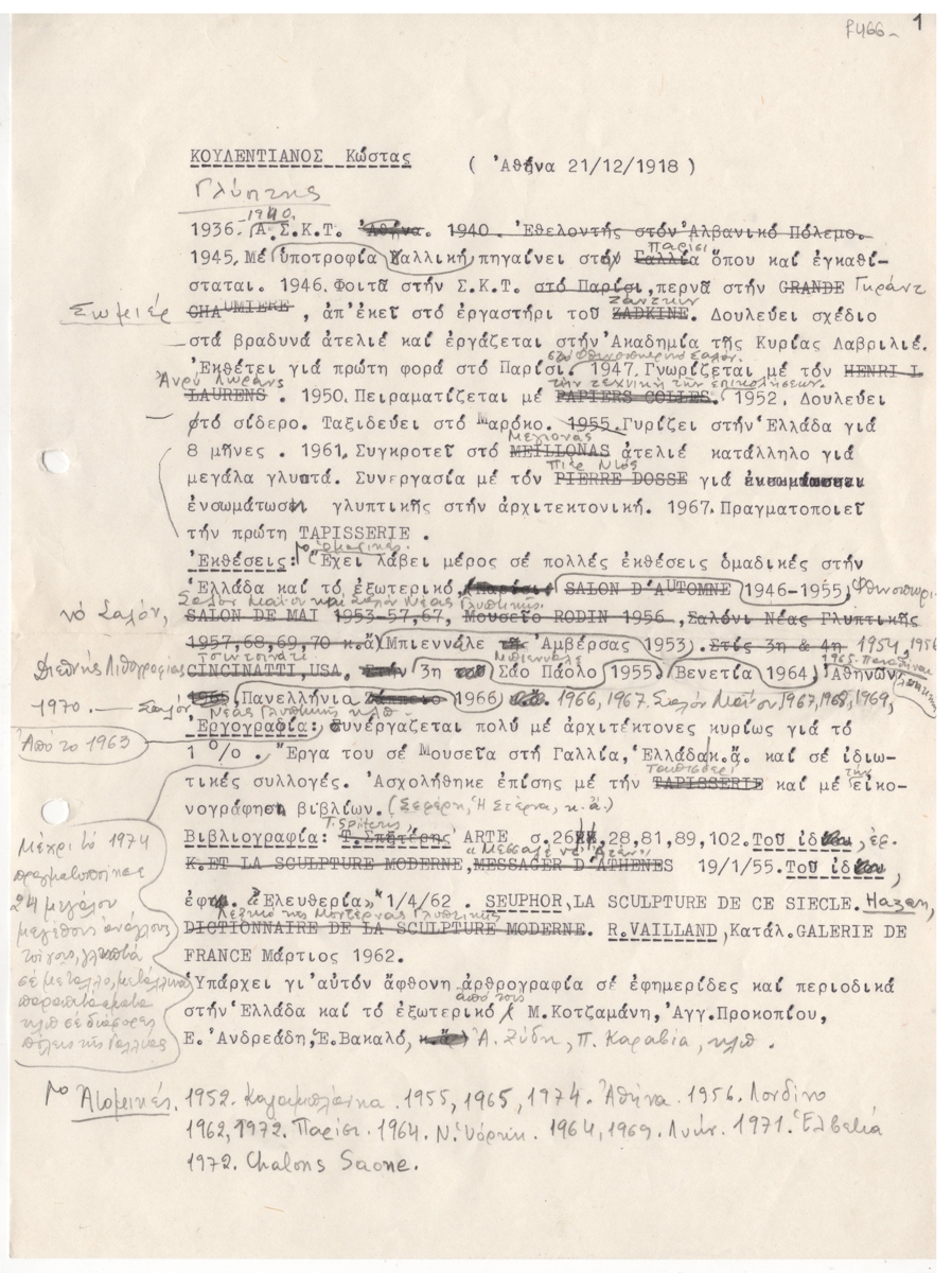 Κείμενο, δακτυλόγραφο, με διορθώσεις και προσθήκες, χειρόγραφες, με μολύβι, στα ελληνικά, χαρτί, 28,5×21,3 εκ. Βιογραφικό σημείωμα του Κώστα Κουλεντιάνου όπου γίνειται αναφορά στις σπουδές και τη δημιουργική του πορεία, τις ατομικές και ομαδικές εκθέσεις στις οποίες συμμετείχε έως το 1972. Επίσης, δίνεται εργογραφία και βιβλιογραφία.