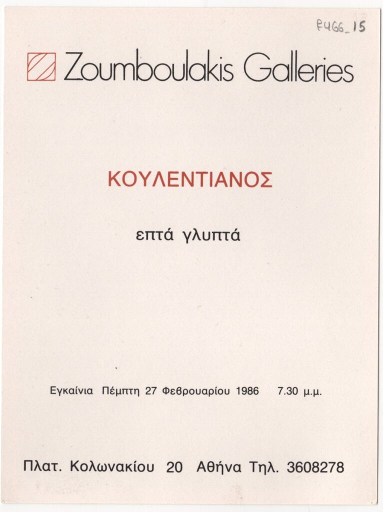 Έντυπο έκθεσης, στα ελληνικά, μονόφυλλο, χαρτόνι, 16,5×12,5 εκ. Πρόσκληση της ατομικής έκθεσης γλυπτικής του Κώστα Κουλεντιανού στην Αθήνα το 1986. Στη μία όψη φωτογραφία του καλλιτέχνη.